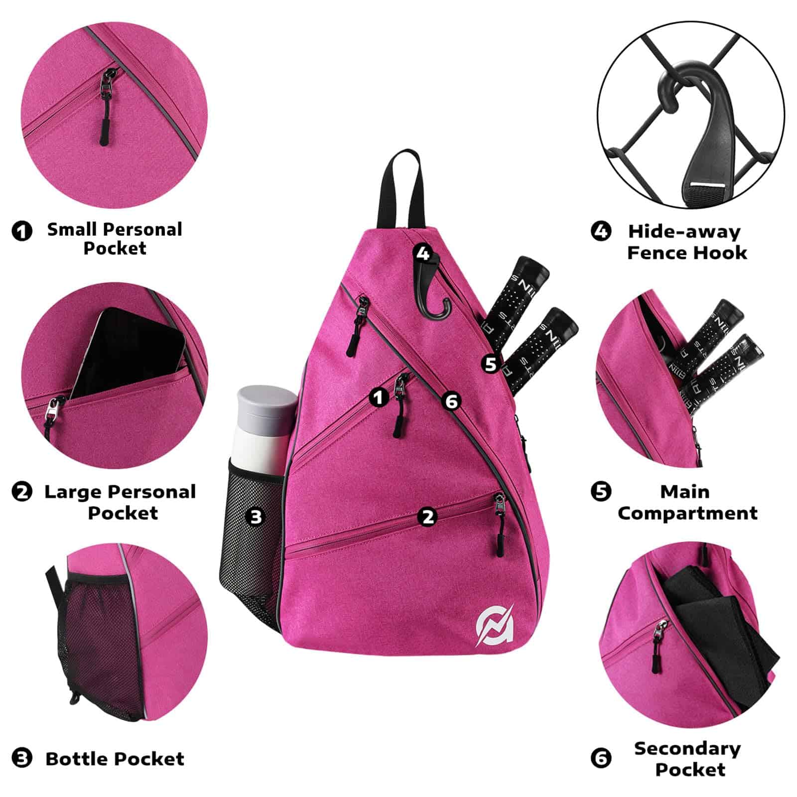4. Gancho para Vallado Oculto: Hay un gancho para vallado oculto en el compartimento principal, puedes enganchar cómodamente la mochila en la pista de pickleball.