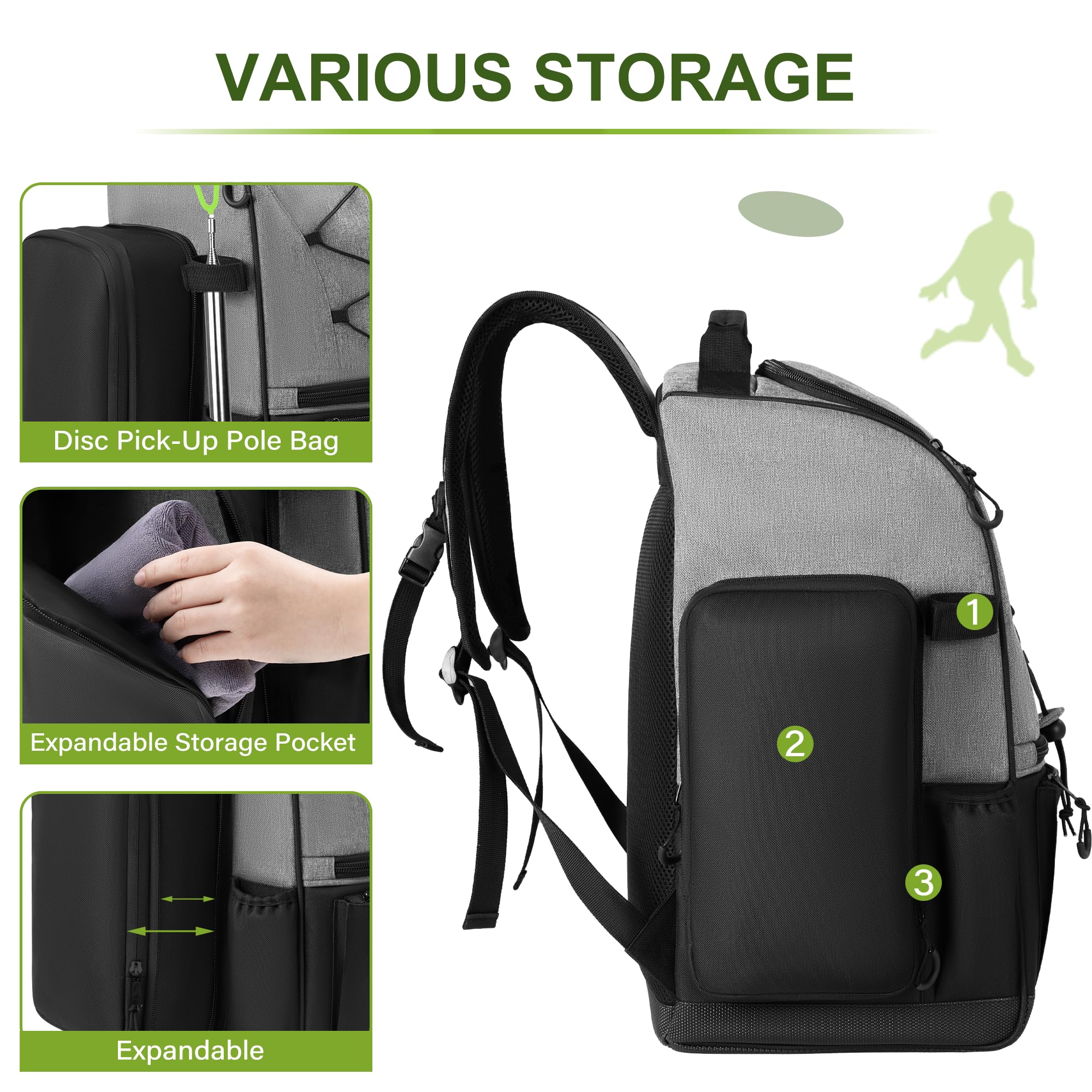 2. Fondo Impermeable: El fondo de la mochila está hecho de material impermeable, ofreciendo protección adicional para tus equipos. Mantiene tus discos y accesorios secos cuando los colocas en el suelo mojado.