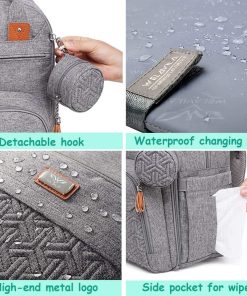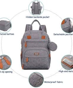 Mochila de pañales unisex con cambiador, bolsillos aislados y porta chupetes para niños y niñas. Esta mochila moderna y polivalente está diseñada para lucir elegante y funcional al mismo tiempo. Incluye clips integrados para cochecito, cambiador acolchado, numerosos bolsillos, asa de agarre y un porta chupetes desmontable. Es una mochila de pañales que te encantará usar como tu bolso diario con todas las características funcionales, facilitando el trabajo como padres.
