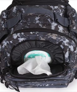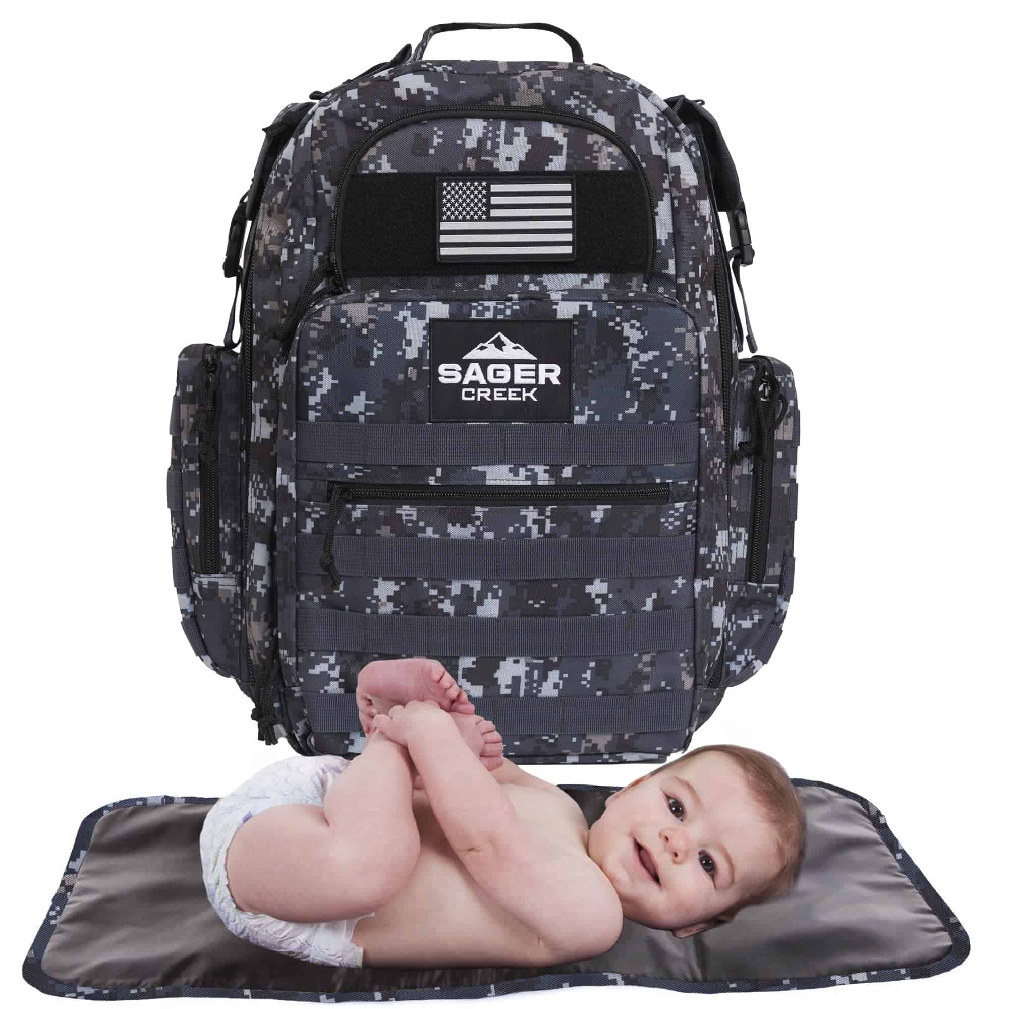 5. OH, SE VERÁ MASCULINO CON ELLA: Con un estilo militar y un diseño muy masculino, esta mochila de pañales para papás lo hace lucir bien. Incluye un parche de velcro genial, para que se vea aún más varonil.