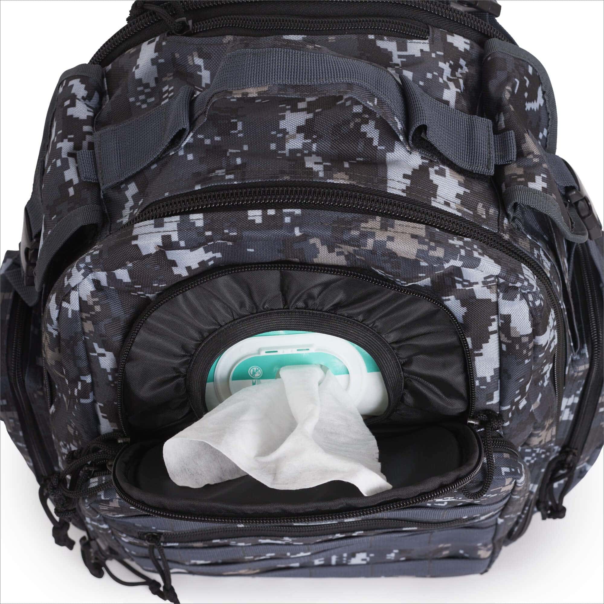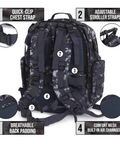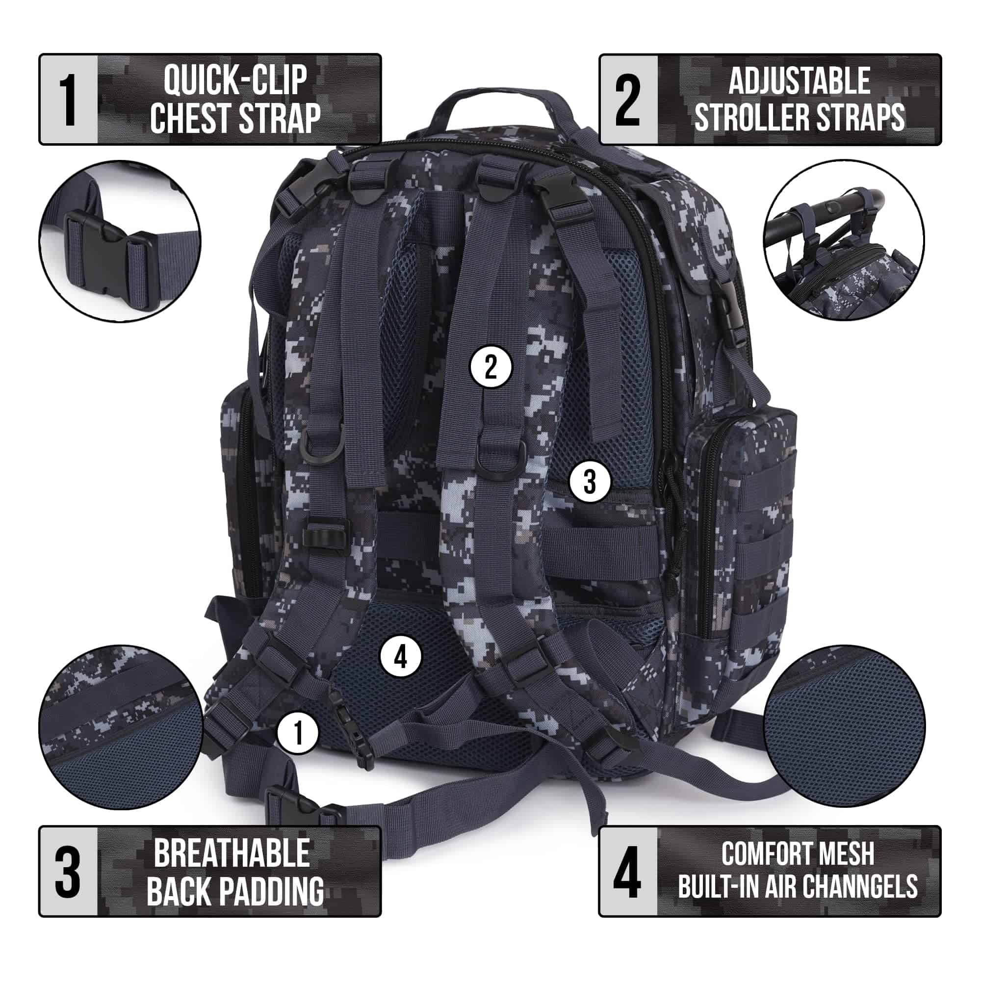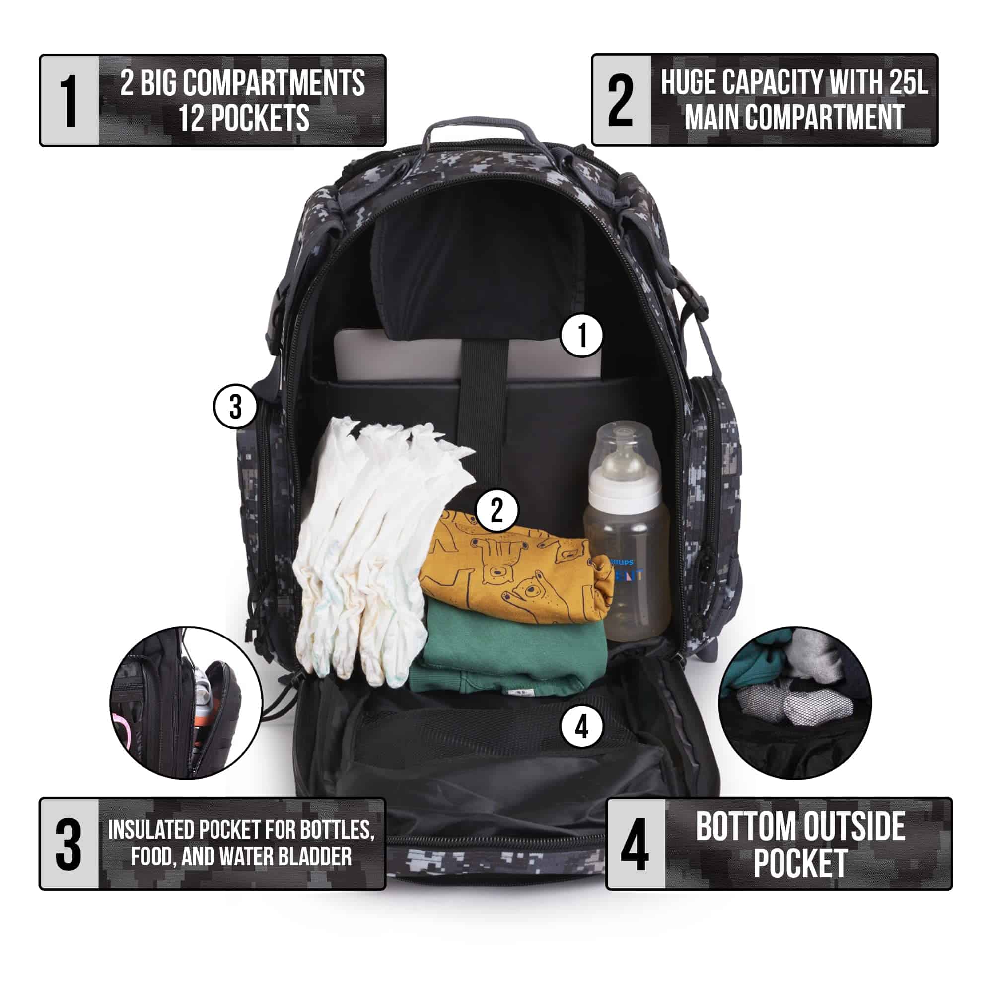 4. NINGÚN JUGUETE O BIBERÓN SE QUEDA ATRÁS: 25L, 2 compartimentos grandes, 12 bolsillos incluyendo un bolsillo exclusivo para toallitas, aislado para biberón, comida y bolsa de agua. Correa de pecho de liberación rápida, correas ajustables para cochecito y sistema de correas molle. Ningún juguete quedará atrás.