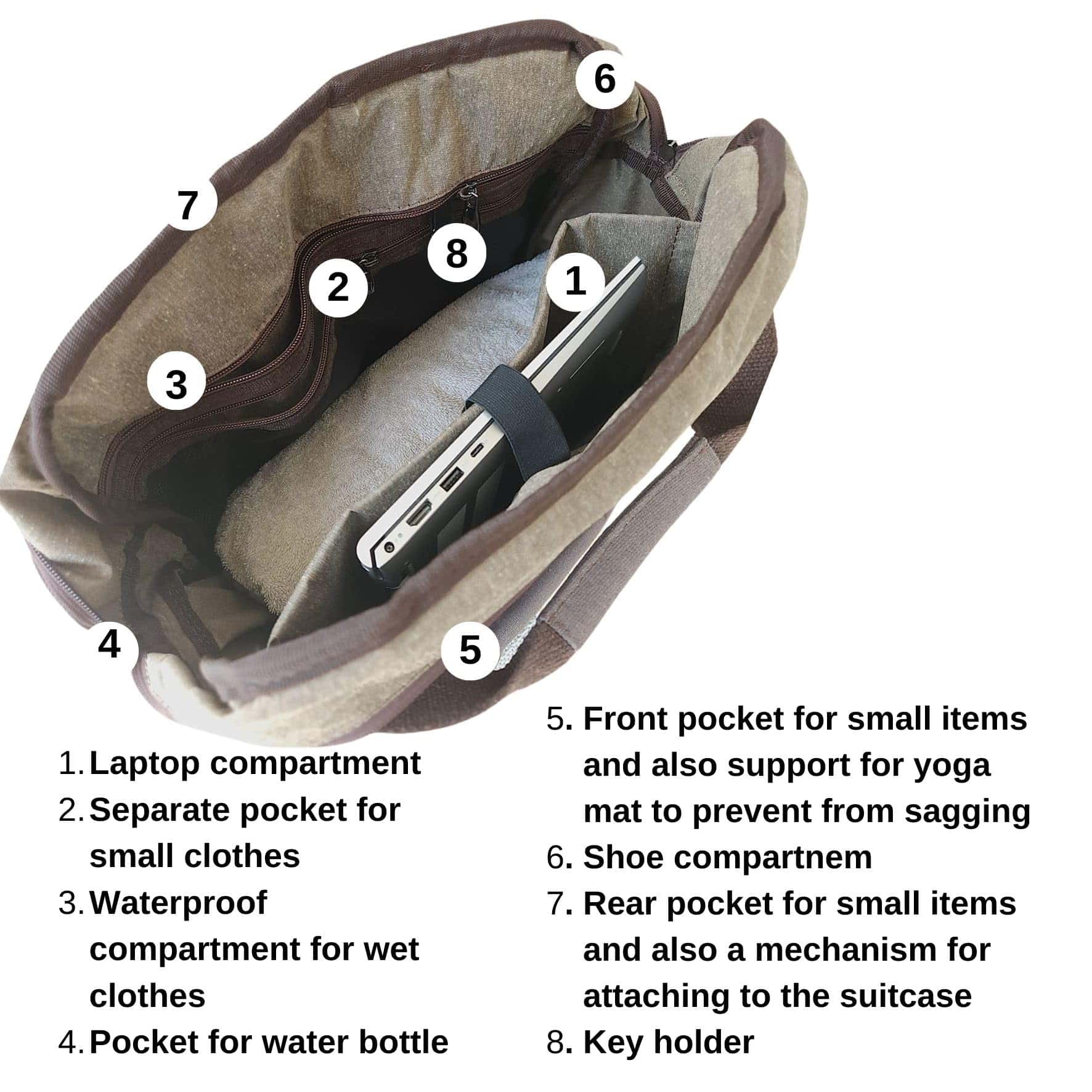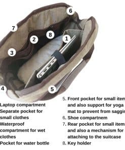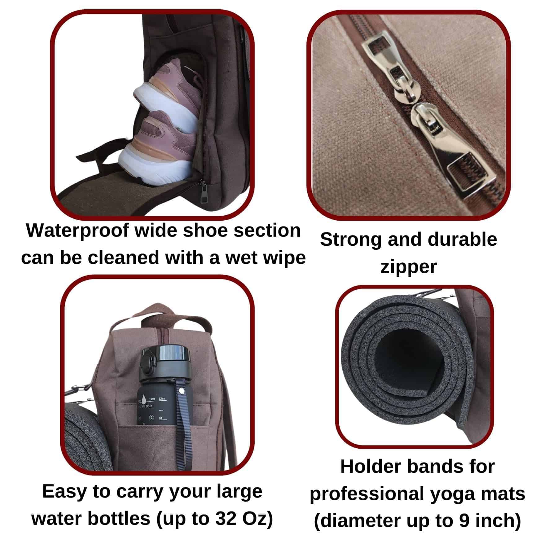 Bolsa de yoga NATI LINE con bolsillo frontal para artículos pequeños y soporte para colchoneta de yoga para evitar que se caiga. Esta bolsa multiusos es perfecta para llevar a la oficina, yoga, viajes y gimnasio. Cuenta con una sección de calzado impermeable que se puede limpiar fácilmente con una toallita húmeda. Además, tiene un bolsillo para una botella de agua de hasta 32 Oz, un compartimento impermeable para ropa mojada y una cremallera resistente y duradera. Mantén tus pertenencias organizadas y protegidas con esta práctica mochila de yoga en color marrón.