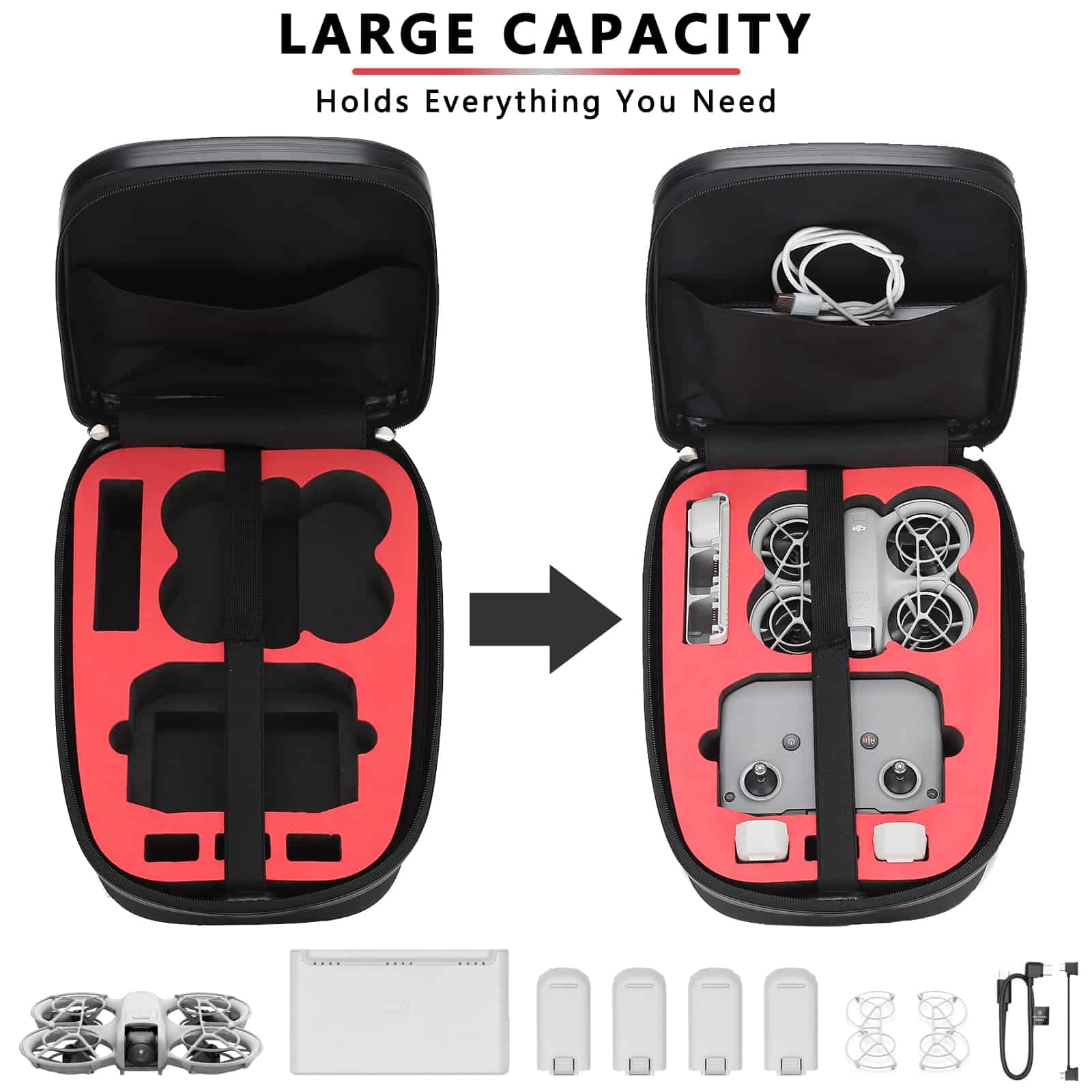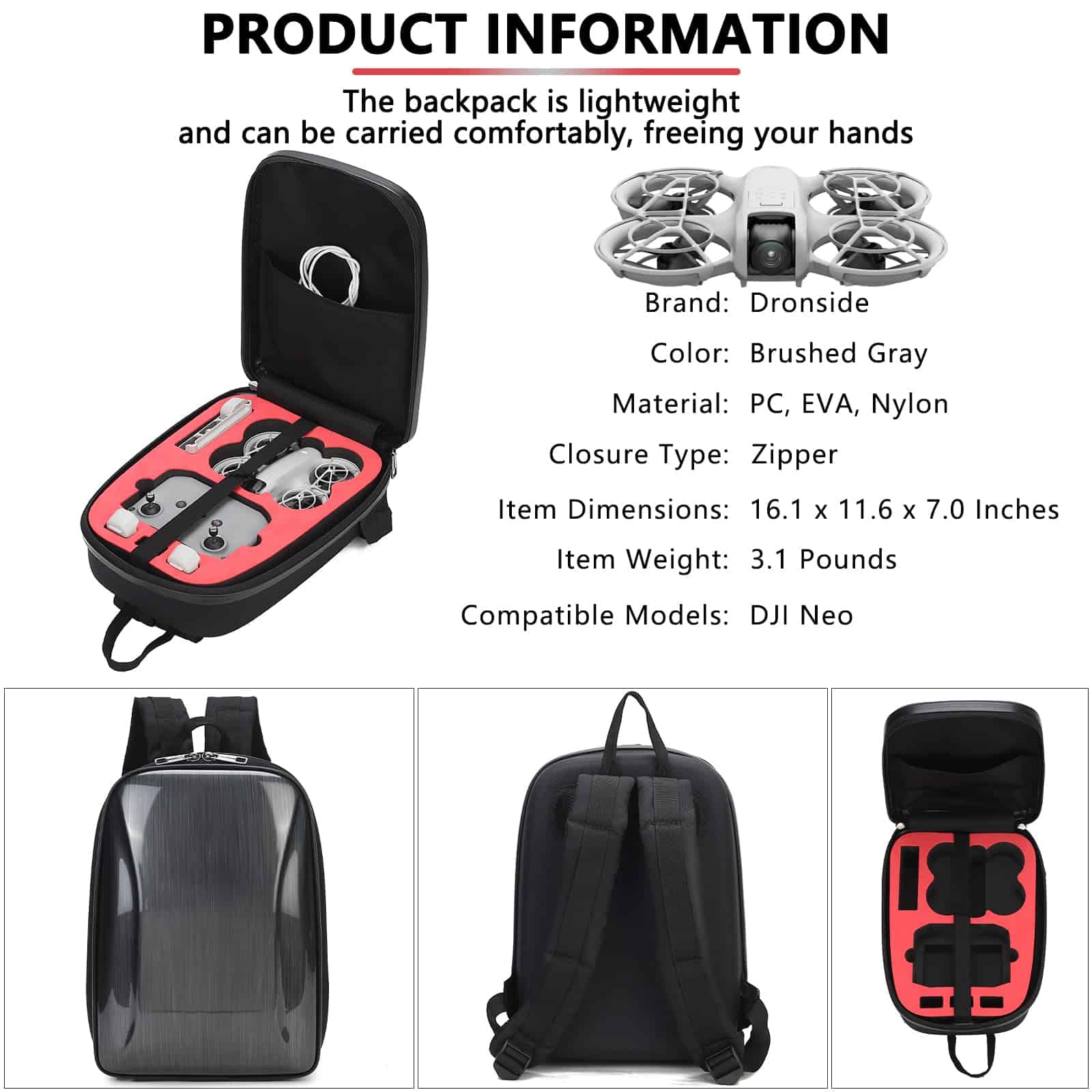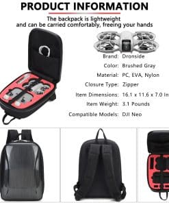 Mochila dura para DJI Neo Fly More Combo – Cómoda mochila a prueba de golpes para accesorios de Drone DJI Neo. Color: Gris. Tamaño: 16.1 x 11.6 x 7.0 pulgadas. Peso: 1.4 kg (3.1 lb). Material: PC + EVA. Compatible con el modelo: DJI Neo Fly More Combo. Espacio de almacenamiento para drone DJI Neo, control remoto DJI RC-N3, baterías de vuelo inteligentes, cargador de batería, filtros ND, hub de carga de baterías, hélices de bajo ruido, cables y otros accesorios. Paquete incluye: 1x Mochila Dura para DJI Neo Drone (NO incluido el drone, control remoto y otros accesorios de drone). Aviso: 1. Debido a la diferencia de luz y pantalla, el color del artículo puede variar ligeramente de las imágenes. 2. Permita diferencias de 1-2 cm debido a la medición manual. 3. Cualquier pregunta sobre esta funda de accesorios para dji air, no dude en contactarnos, ¡haremos nuestro mejor esfuerzo para servirle!