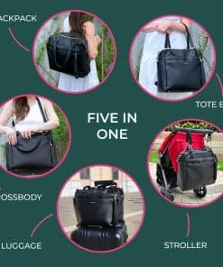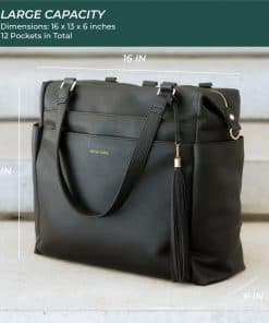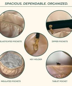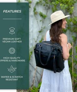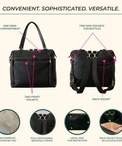 Esta mochila para pañales Kaela Marie es la combinación perfecta de estilo y funcionalidad. Está fabricada con cuero vegano suave de alta calidad que le brinda una sensación de lujo. Los cierres de alta calidad, los herrajes dorados y el forro resistente al agua aseguran durabilidad y protección. Con un diseño versátil, esta bolsa cuenta con correas de mochila desmontables que permiten cambiar fácilmente entre una mochila, bolso de mano y bolso cruzado. También se puede sujetar a un cochecito mediante las correas complementarias o a una maleta utilizando el bolsillo trasero. Los pies metálicos protegen el fondo de la bolsa de daños. Con dimensiones generosas de 16 x 13 x 6 pulgadas, esta mochila para pañales ofrece mucho espacio para tus pertenencias y los elementos esenciales de tu pequeño. La bolsa cuenta con un amplio compartimento principal y 12 bolsillos en total. Los 7 bolsillos internos incluyen espacios con cremallera, bolsillos aislados para botellas, bolsillos elásticos y un bolsillo para tablet. En el exterior, hay 2 bolsillos con cremallera grandes, 2 bolsillos laterales para biberones y 1 bolsillo trasero para un acceso rápido o para colocarla en una maleta. Mantén todo organizado y a mano con esta elegante y funcional mochila para pañales.