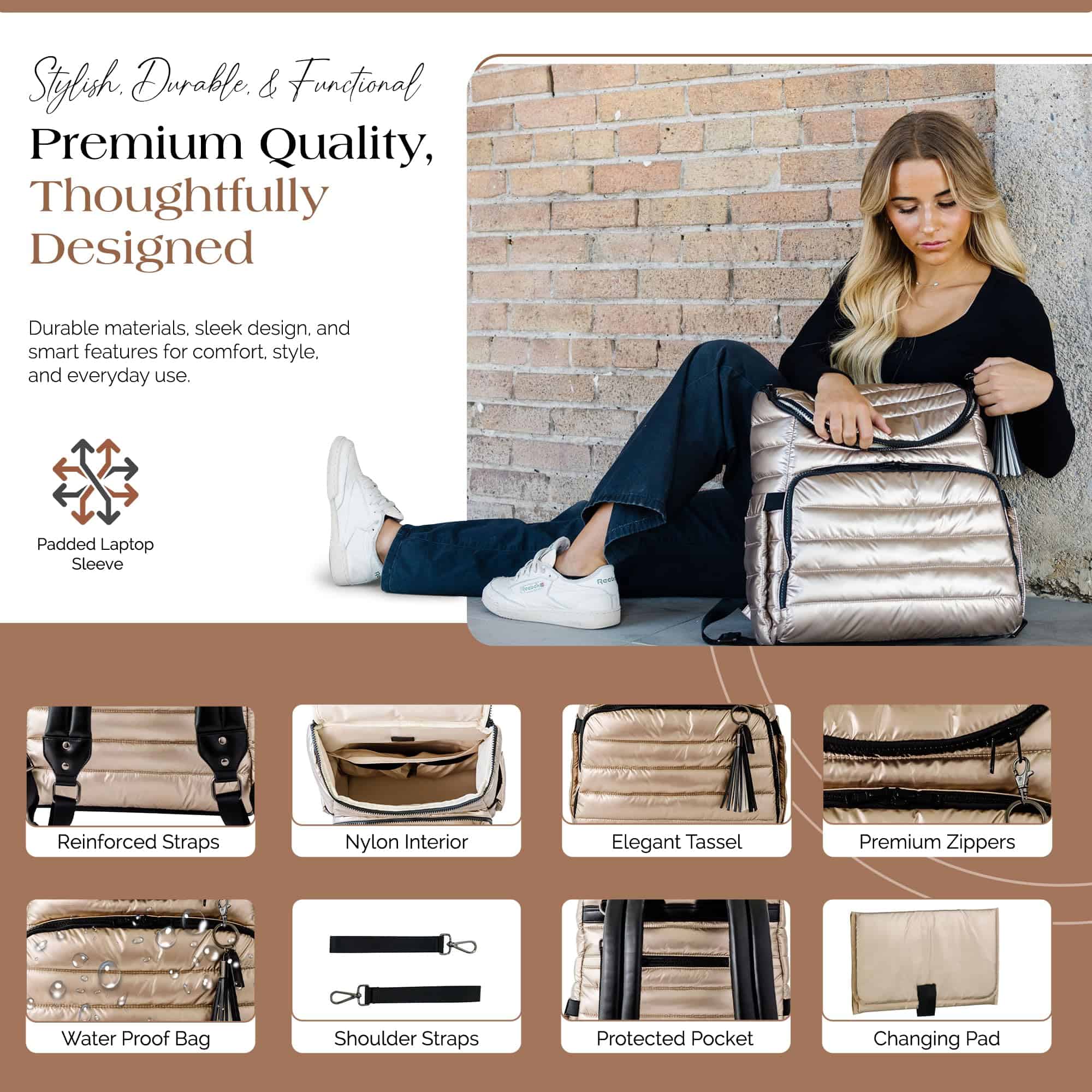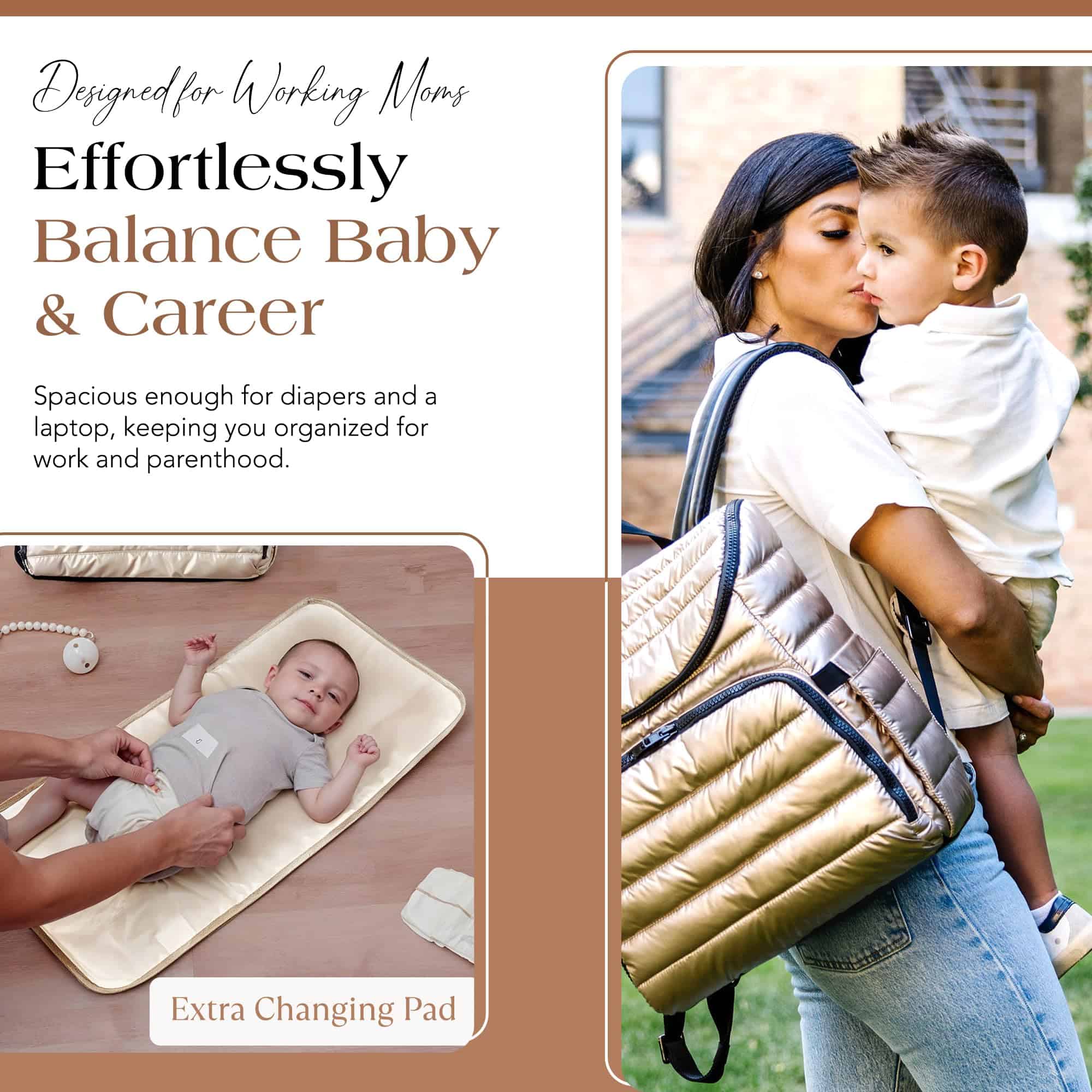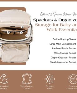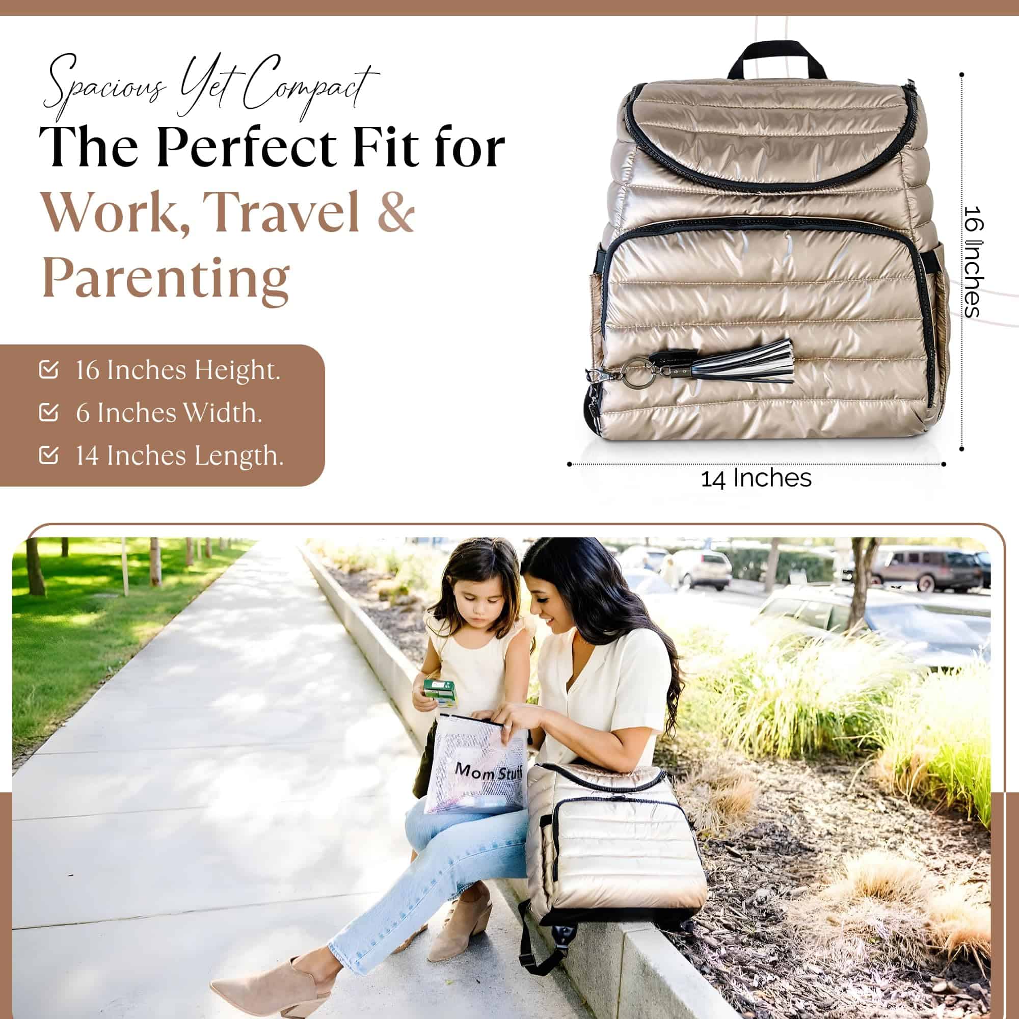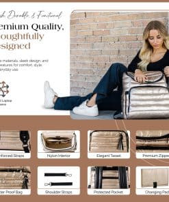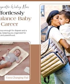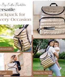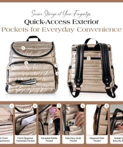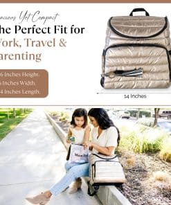 Nuestra moderna mochila pañalera está diseñada para la eficiencia, con múltiples bolsillos multifuncionales para una organización sin problemas. Un espacioso compartimento principal sostiene artículos esenciales para el bebé, mientras que los bolsillos organizadores estructurados mantienen a mano toallitas, biberones y objetos personales. La funda acolchada para portátil de la mochila pañalera asegura de manera segura dispositivos de hasta 15″, convirtiéndola en una opción práctica para el trabajo, la escuela y los viajes. Con un elegante exterior dorado, esta versátil mochila pañalera se adapta fácilmente de la tarea de cambiar pañales a la vida diaria. El diseño de 15″ x 13.4″ x 6.7″ ofrece amplio almacenamiento sin volumen, funcionando tanto como mochila pañalera como mochila de viaje para profesionales y padres por igual. El interior y exterior resistentes al agua y fáciles de limpiar de nuestra mochila pañalera dorada garantizan un mantenimiento sin esfuerzo. Esta mochila pañalera para mamá viene con una colchoneta impermeable para cambios de pañales, mientras que sus correas desmontables para coche de bebé ofrecen comodidad manos libres durante las salidas. Con correas ajustables, un interior espacioso y almacenamiento seguro, esta mochila pañalera es perfecta para estilos de vida ocupados. Ya sea para la crianza, el trabajo o los viajes, la mochila ejecutiva para mujeres ofrece organización, durabilidad y facilidad de uso en un diseño elegante.