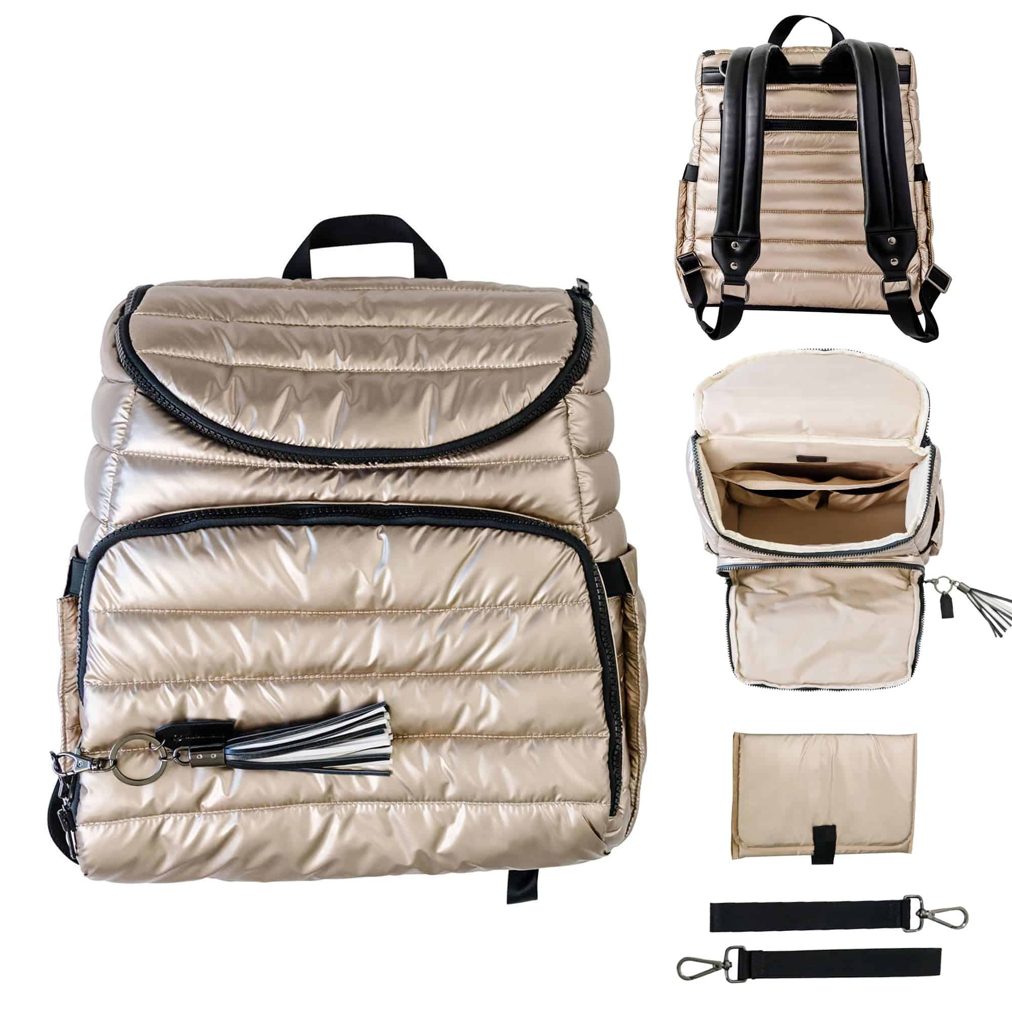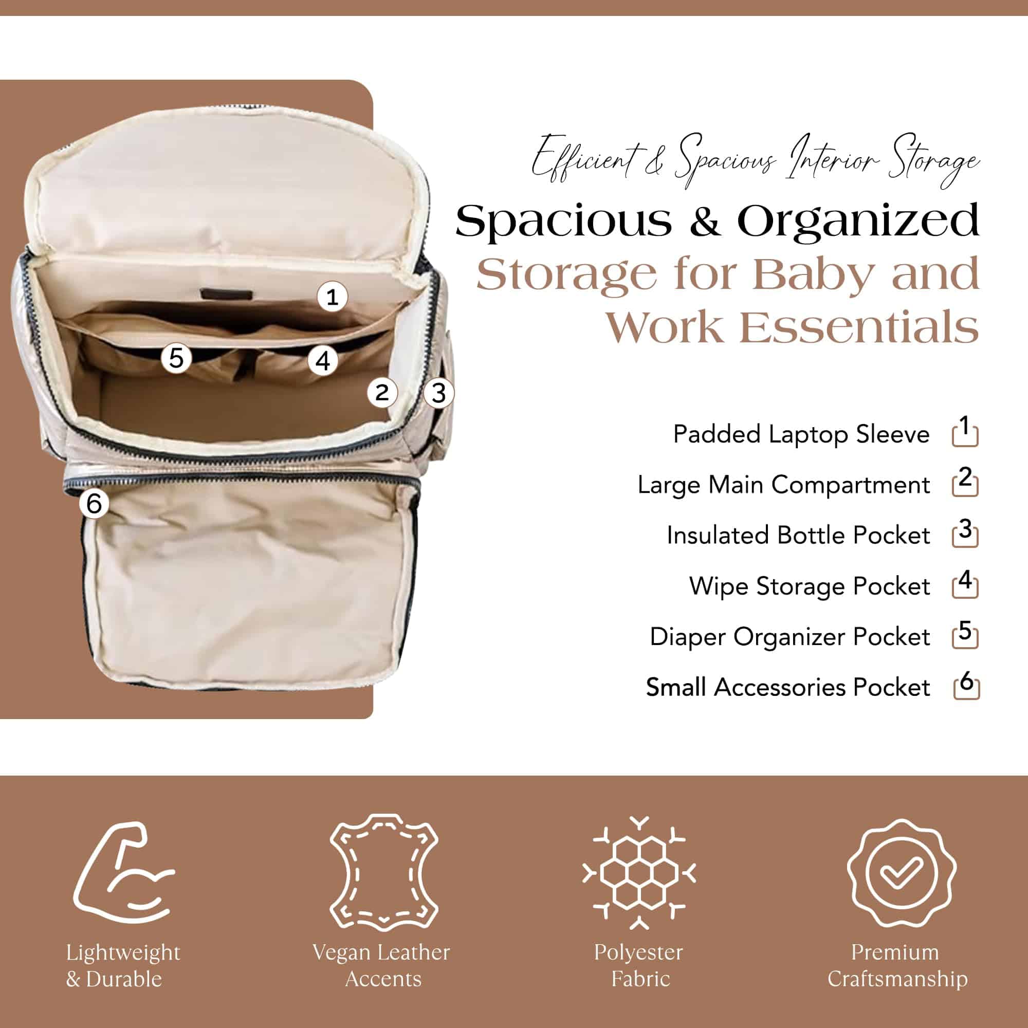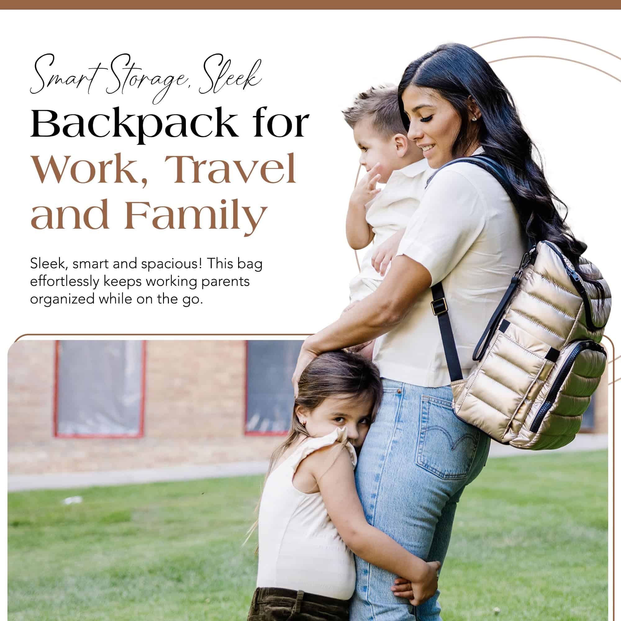 Nuestra moderna mochila pañalera está diseñada para la eficiencia, con múltiples bolsillos multifuncionales para una organización sin problemas. Un espacioso compartimento principal sostiene artículos esenciales para el bebé, mientras que los bolsillos organizadores estructurados mantienen a mano toallitas, biberones y objetos personales. La funda acolchada para portátil de la mochila pañalera asegura de manera segura dispositivos de hasta 15″, convirtiéndola en una opción práctica para el trabajo, la escuela y los viajes. Con un elegante exterior dorado, esta versátil mochila pañalera se adapta fácilmente de la tarea de cambiar pañales a la vida diaria. El diseño de 15″ x 13.4″ x 6.7″ ofrece amplio almacenamiento sin volumen, funcionando tanto como mochila pañalera como mochila de viaje para profesionales y padres por igual. El interior y exterior resistentes al agua y fáciles de limpiar de nuestra mochila pañalera dorada garantizan un mantenimiento sin esfuerzo. Esta mochila pañalera para mamá viene con una colchoneta impermeable para cambios de pañales, mientras que sus correas desmontables para coche de bebé ofrecen comodidad manos libres durante las salidas. Con correas ajustables, un interior espacioso y almacenamiento seguro, esta mochila pañalera es perfecta para estilos de vida ocupados. Ya sea para la crianza, el trabajo o los viajes, la mochila ejecutiva para mujeres ofrece organización, durabilidad y facilidad de uso en un diseño elegante.