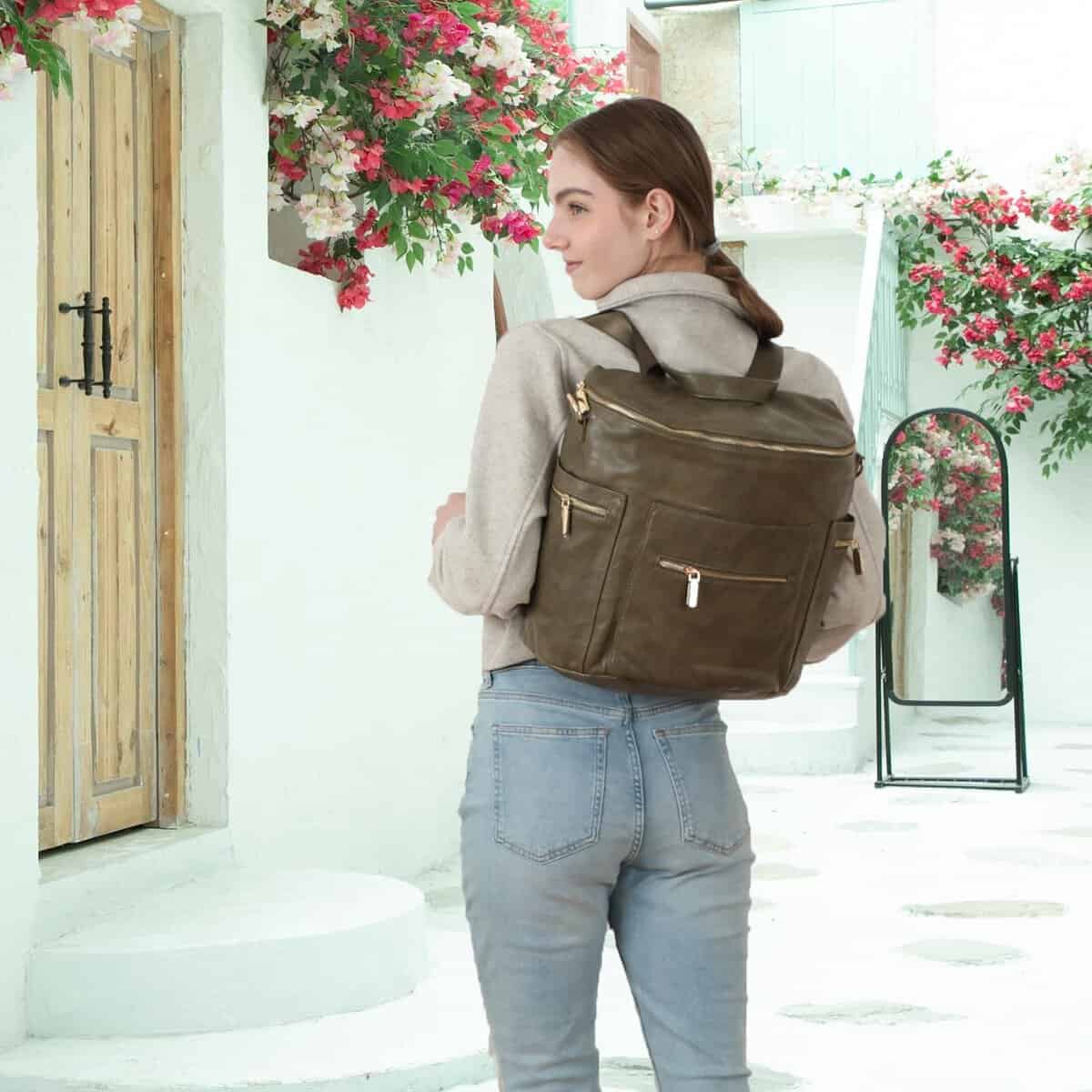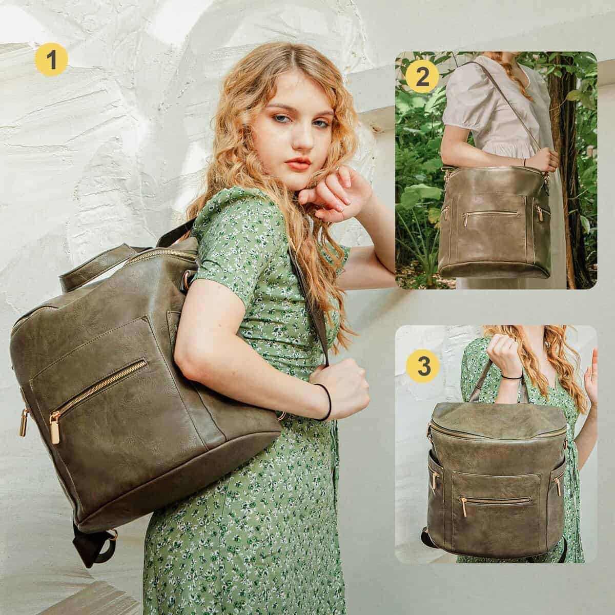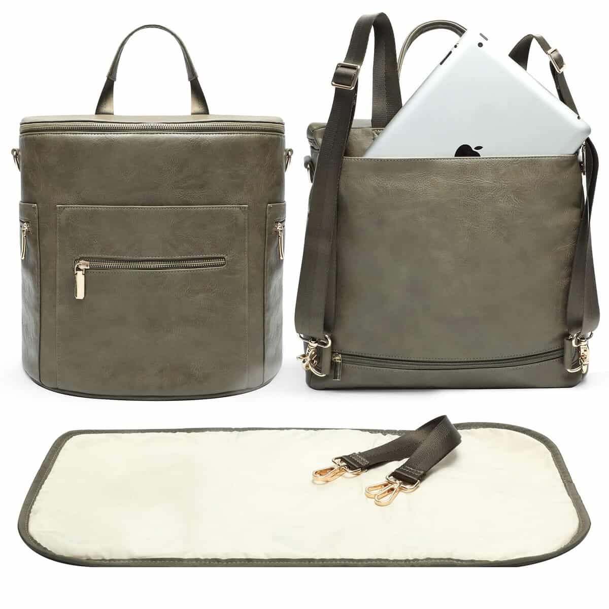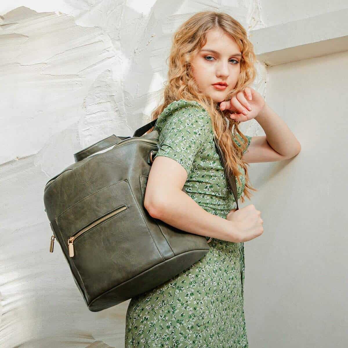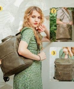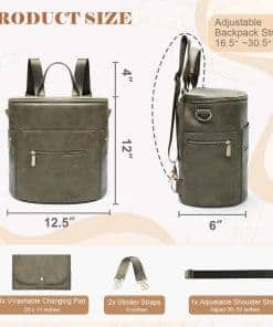 2. Moda y función se unen La mochila pañalera de miss fong es un equilibrio artístico entre moda y función. La elección en la búsqueda de registro de bebé, opción de regalo en el baby shower. Material de la bolsa de bebé cuero ecológico, interior de nailon 100% impermeable, se puede limpiar la mochila con un paño húmedo. Correas de hombro y mochila lisas como la seda, se ajustan con una sola mano. Colchoneta de cambio 50% cuero PU y 50% nailon impermeable. Cremallera-18K Gold. Calentador de biberones: materiales de aislamiento térmico. El llavero fijo sujeta llaves y chupones.