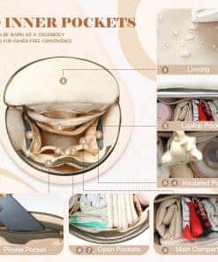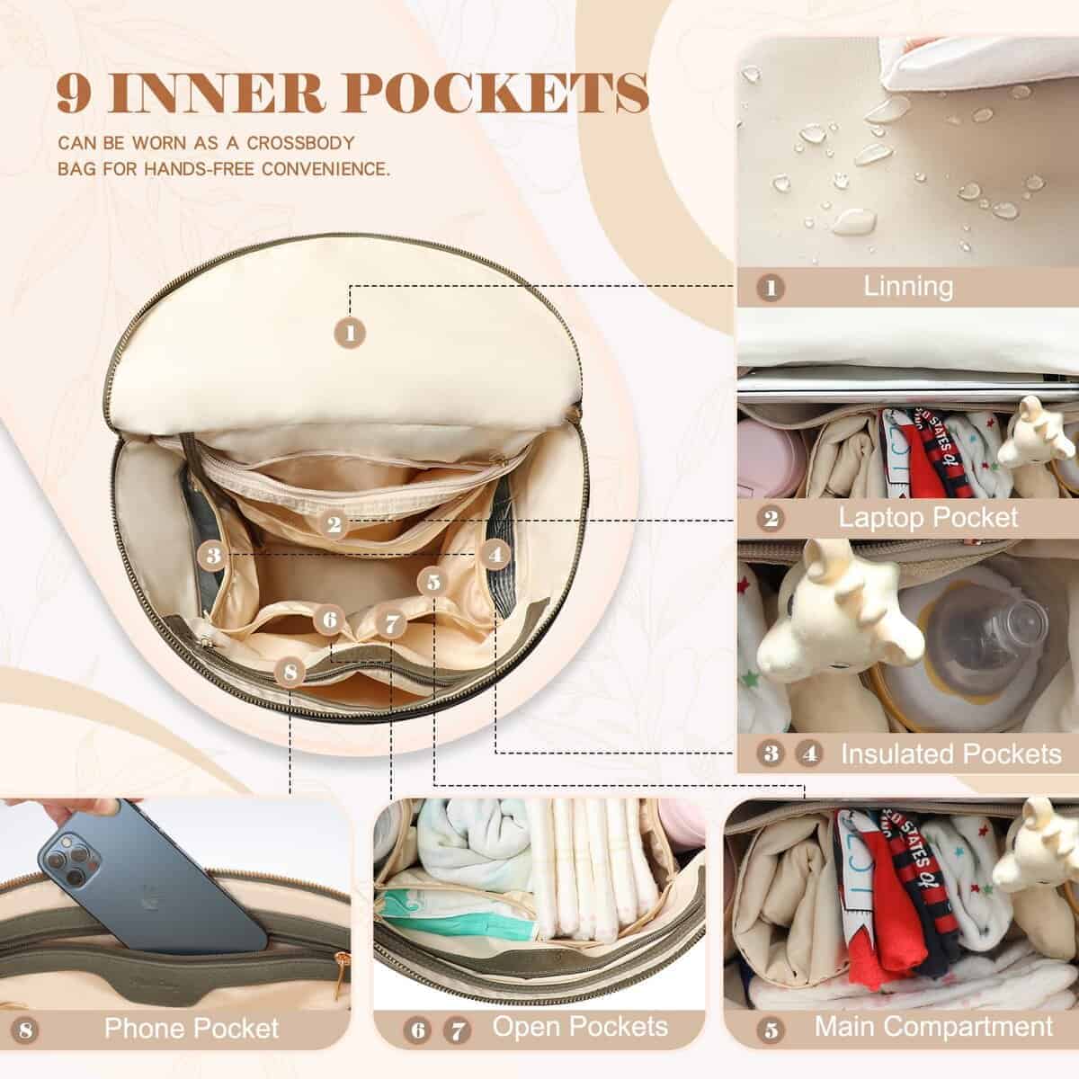 3. Diseño de gran capacidad de la mochila pañalera Tote Esta mochila pañalera de mamá tiene mucho espacio para almacenar de manera ordenada los elementos esenciales tuyos y de tu bebé. 7 bolsillos externos-1 bolsillo trasero con cremallera para teléfonos, 3 bolsillos con cremallera y 3 bolsillos abiertos para organizar tu billetera, toallitas, llaves, desinfectante de manos, etc. 9 bolsillos internos-4 bolsillos abiertos, 2 bolsillos con cremallera, 2 grandes bolsillos aislados para biberones y alimentos. Un compartimento principal de gran capacidad puede contener los elementos esenciales del bebé para 2 niños, como pañales, ropa y juguetes. Bolsas de bebé multifuncionales.
