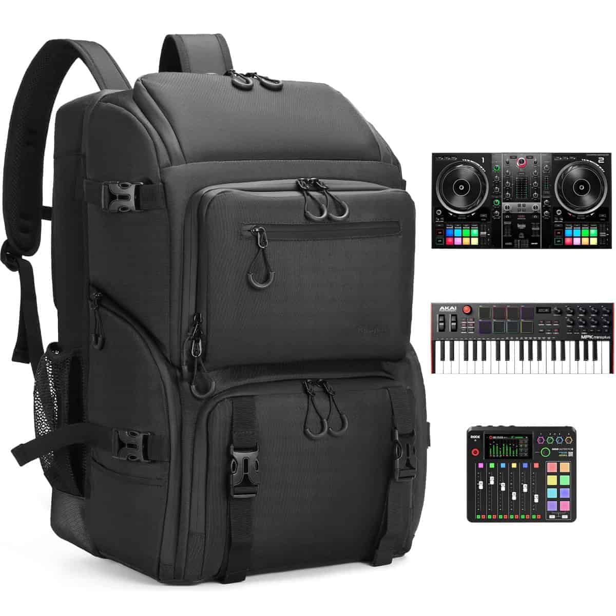 Bolso para DJ diseñado para eventos en clubes, DJs móviles, músicos de eventos y más. El compartimento principal es lo suficientemente espacioso como para adaptarse a la mayoría de los laptops de 17″ pulgadas, auriculares, cables y otros accesorios esenciales para DJs. El interior del compartimento del mezclador está forrado con material resistente a los arañazos y suave para garantizar la protección de tu equipo durante el transporte. Las correas ajustables y las hebillas en los lados y la parte inferior de la bolsa aseguran que tu equipo esté seguro cuando la bolsa se carga o cuelgan accesorios. La mochila es perfecta para viajar, cumpliendo con las restricciones de equipaje de mano y ofreciendo versatilidad como mochila, maletín o para sujetarse al equipaje con la ranura conveniente. Ten en cuenta que el material elástico en el borde del compartimento grande de la mochila requiere un ajuste manual para almacenar controladores más grandes. Esta bolsa está diseñada para personas con una altura superior a 170 cm / 5.55 pies o con una constitución robusta, asegurándose de que se ajuste cómodamente. La mochila para DJ Rabjen ofrece un excelente servicio al cliente por correo electrónico las 24 horas, garantizando respuestas rápidas a cualquier problema en un plazo de 24 horas. Además, se incluyen opciones de devolución y reemplazo, así como soporte de por vida. ¡Esta mochila es la elección ideal para DJs móviles, músicos de eventos y más!