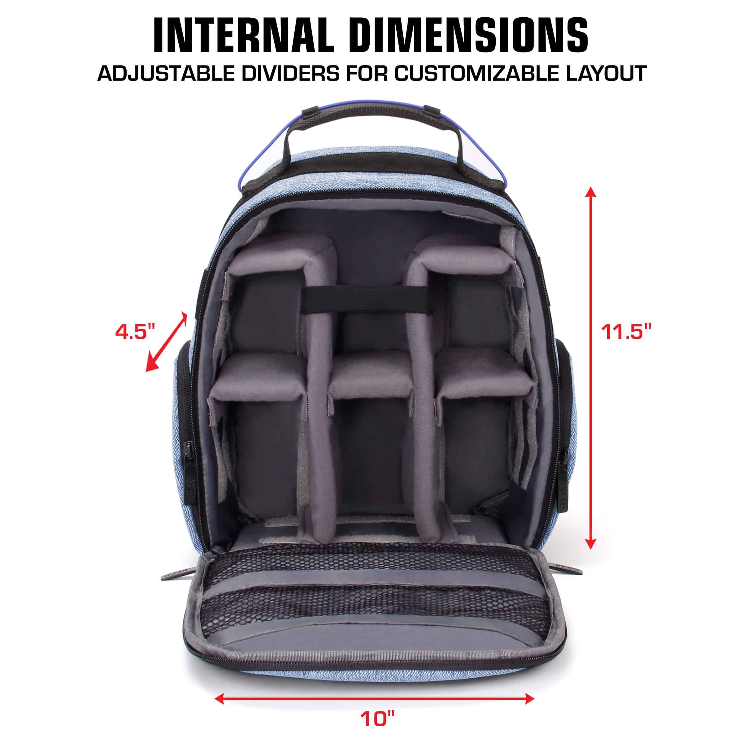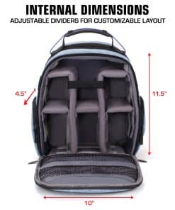 Mantén tu drone y todos sus accesorios seguros y organizados con esta mochila para drone de USA Gear. Con un diseño compacto y un interior personalizable, esta mochila ofrece la opción de crear compartimentos y bolsillos a medida para lentes de varios tamaños, hélices de repuesto, baterías, controladores y mucho más. La base con revestimiento resistente al agua protege tu drone y accesorios de la humedad al colocarlo en superficies húmedas. El acolchado interior resistente a los arañazos mantiene tu drone pequeño o mediano seguro durante los viajes. ¡No dejes nada al azar con esta mochila de alta calidad para tu drone! Dimensiones interiores: 11.5 x 10 x 4.5 pulgadas.