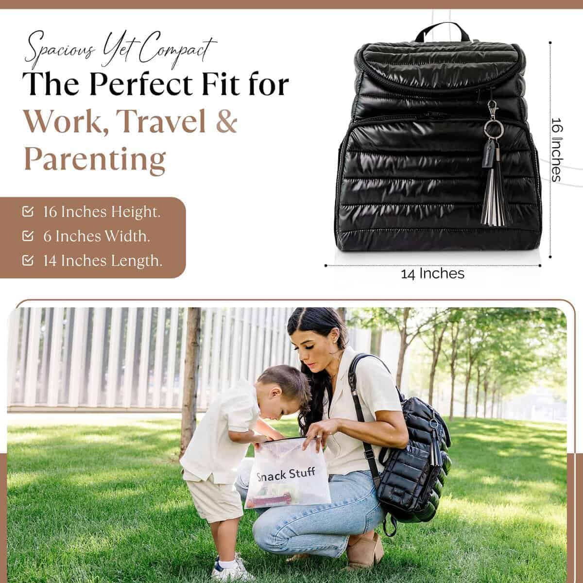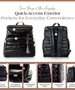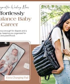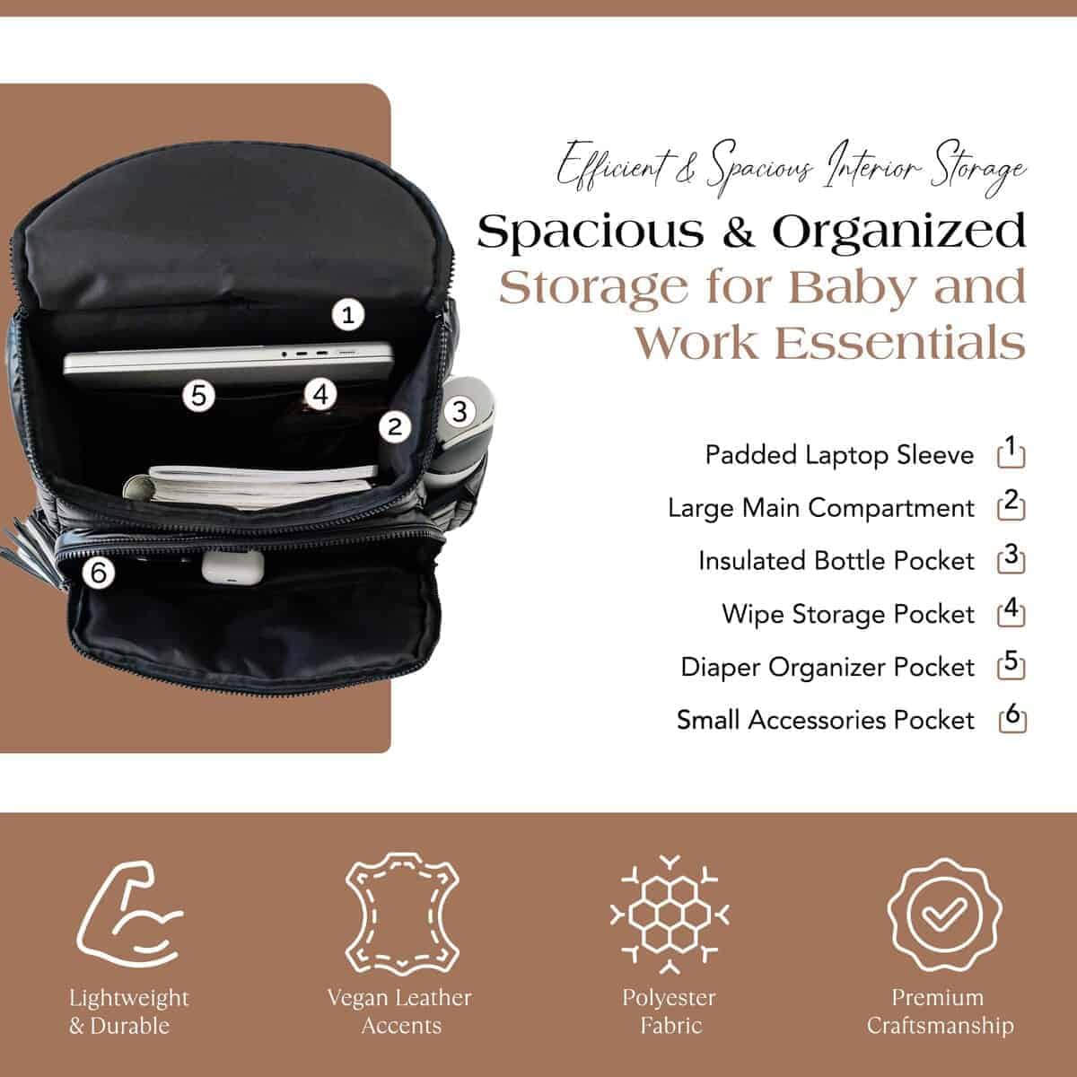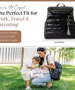 Nuestra moderna mochila para pañales está diseñada para la eficiencia, con bolsillos multifuncionales para una organización sin esfuerzo. Un espacioso compartimento principal contiene elementos esenciales para el bebé, mientras que los bolsillos organizadores estructurados mantienen toallitas, botellas y objetos personales al alcance. El bolsillo acolchado para laptop de la mochila para pañales se ajusta de forma segura a dispositivos de hasta 15″, lo que la convierte en una opción práctica para el trabajo, la escuela y los viajes. Con un exterior elegante, esta versátil mochila para pañales se transforma sin esfuerzo de la tarea de cambiar pañales a la vida diaria. El diseño de 15″ x 12″ x 7″ ofrece un amplio almacenamiento sin volumen, funcionando tanto como una mochila para pañales como una mochila de viaje para profesionales y padres por igual. El interior y el exterior lavables y resistentes al agua de nuestra mochila para pañales negra garantizan un mantenimiento sin esfuerzo. Esta mochila para pañales para mamá viene con un cambiador impermeable para cambios de pañales sin complicaciones, mientras que sus correas desmontables para el cochecito ofrecen comodidad manos libres durante las salidas. Con correas ajustables, un interior espacioso y almacenamiento seguro, esta mochila para pañales negra cumple con estilos de vida ocupados. Ya sea para la crianza de los hijos, el desplazamiento o los viajes, la mochila ejecutiva para mujeres ofrece organización, durabilidad y facilidad de uso en un diseño elegante.