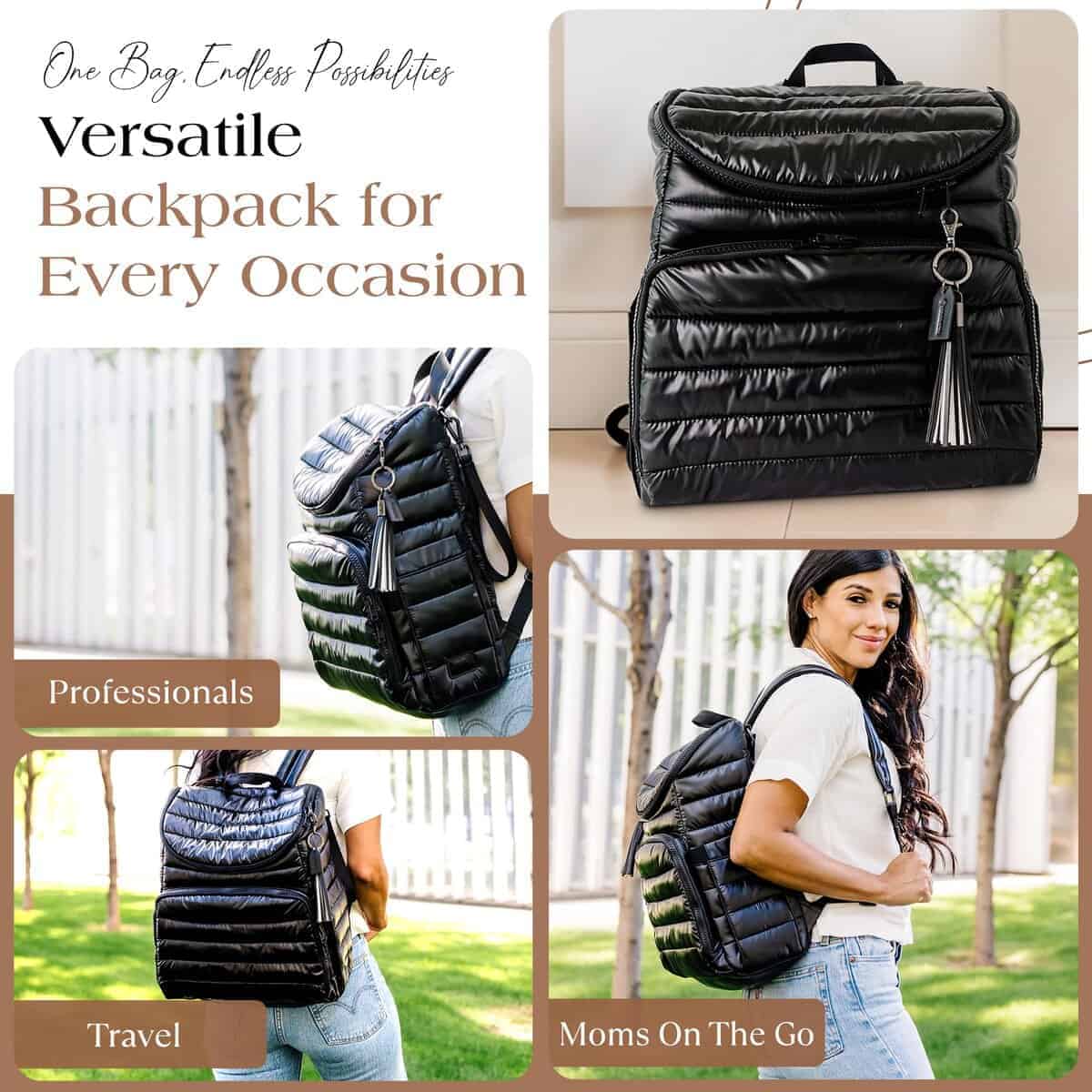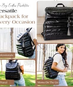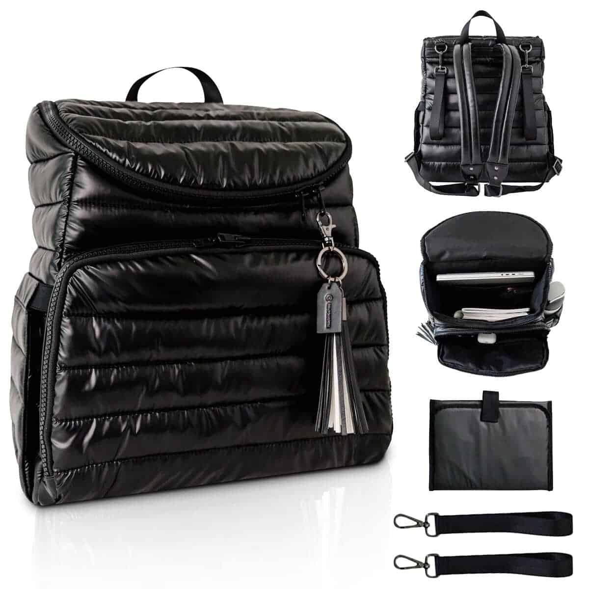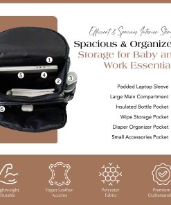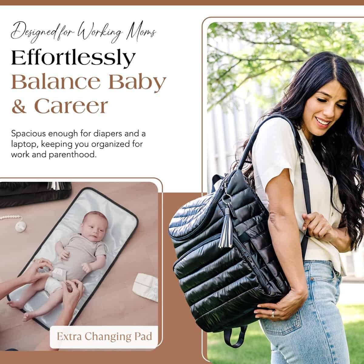 Nuestra moderna mochila para pañales está diseñada para la eficiencia, con bolsillos multifuncionales para una organización sin esfuerzo. Un espacioso compartimento principal contiene elementos esenciales para el bebé, mientras que los bolsillos organizadores estructurados mantienen toallitas, botellas y objetos personales al alcance. El bolsillo acolchado para laptop de la mochila para pañales se ajusta de forma segura a dispositivos de hasta 15″, lo que la convierte en una opción práctica para el trabajo, la escuela y los viajes. Con un exterior elegante, esta versátil mochila para pañales se transforma sin esfuerzo de la tarea de cambiar pañales a la vida diaria. El diseño de 15″ x 12″ x 7″ ofrece un amplio almacenamiento sin volumen, funcionando tanto como una mochila para pañales como una mochila de viaje para profesionales y padres por igual. El interior y el exterior lavables y resistentes al agua de nuestra mochila para pañales negra garantizan un mantenimiento sin esfuerzo. Esta mochila para pañales para mamá viene con un cambiador impermeable para cambios de pañales sin complicaciones, mientras que sus correas desmontables para el cochecito ofrecen comodidad manos libres durante las salidas. Con correas ajustables, un interior espacioso y almacenamiento seguro, esta mochila para pañales negra cumple con estilos de vida ocupados. Ya sea para la crianza de los hijos, el desplazamiento o los viajes, la mochila ejecutiva para mujeres ofrece organización, durabilidad y facilidad de uso en un diseño elegante.