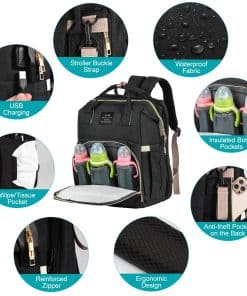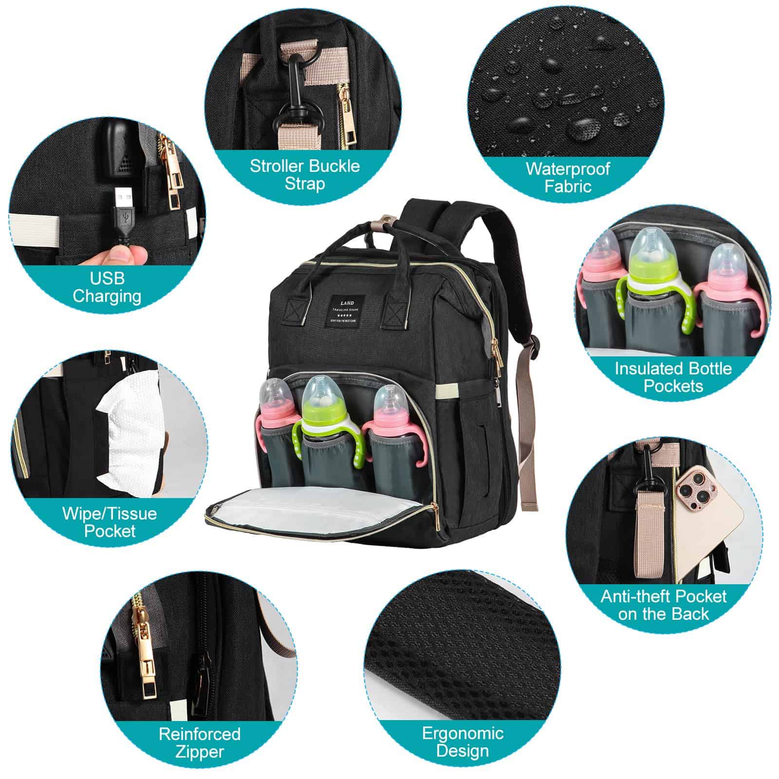 5. Forma conveniente de llevar Esta mochila para pañales de bebé está diseñada con correas de hombro acolchadas gruesas y anchas con asas fáciles de agarrar para garantizar la comodidad durante el uso. También viene con correas adicionales para el cochecito que se pueden colocar en el cochecito para aliviar la presión de tus hombros. Esta mochila para pañales se puede usar como mochila, bolso de mano o simplemente colgada en el cochecito.
