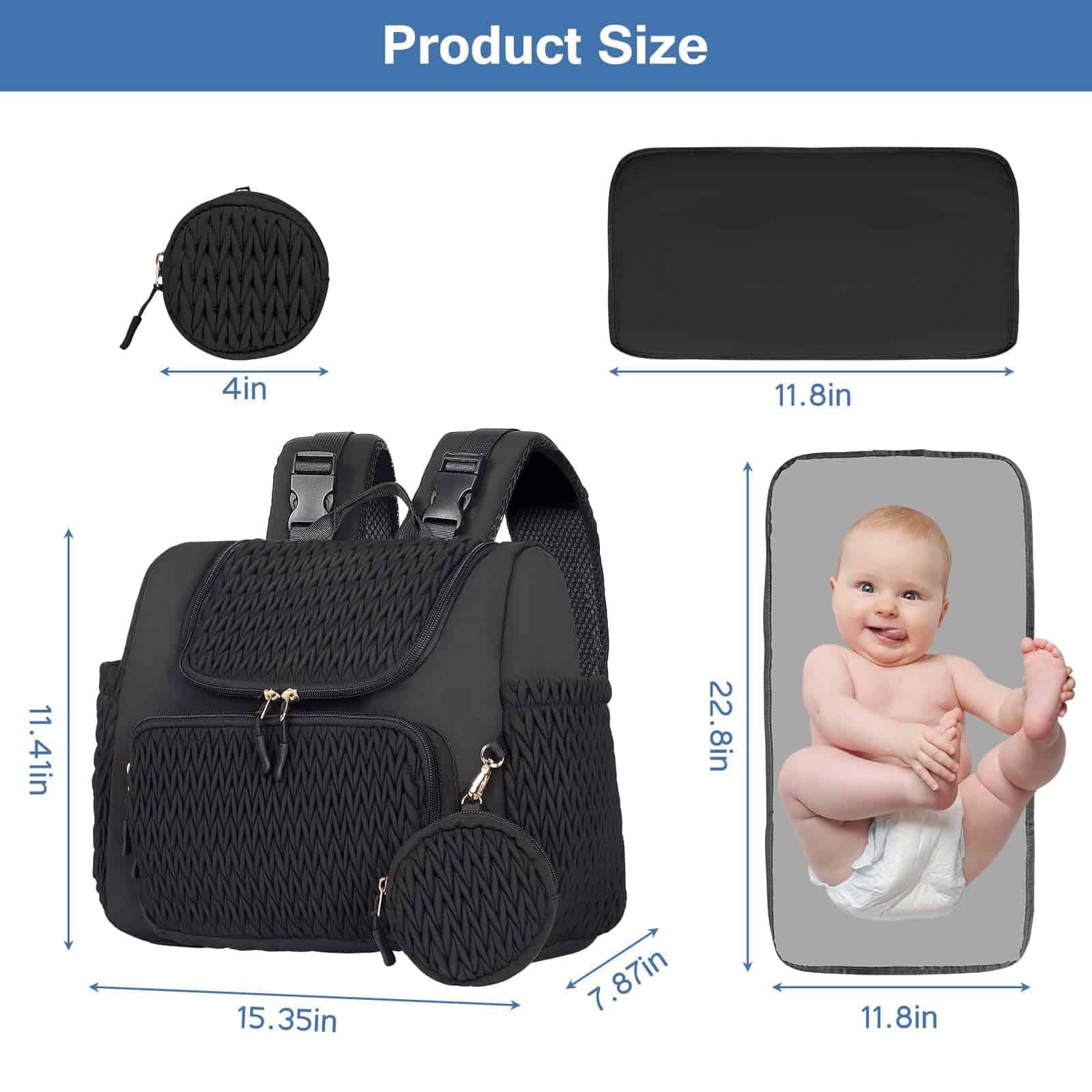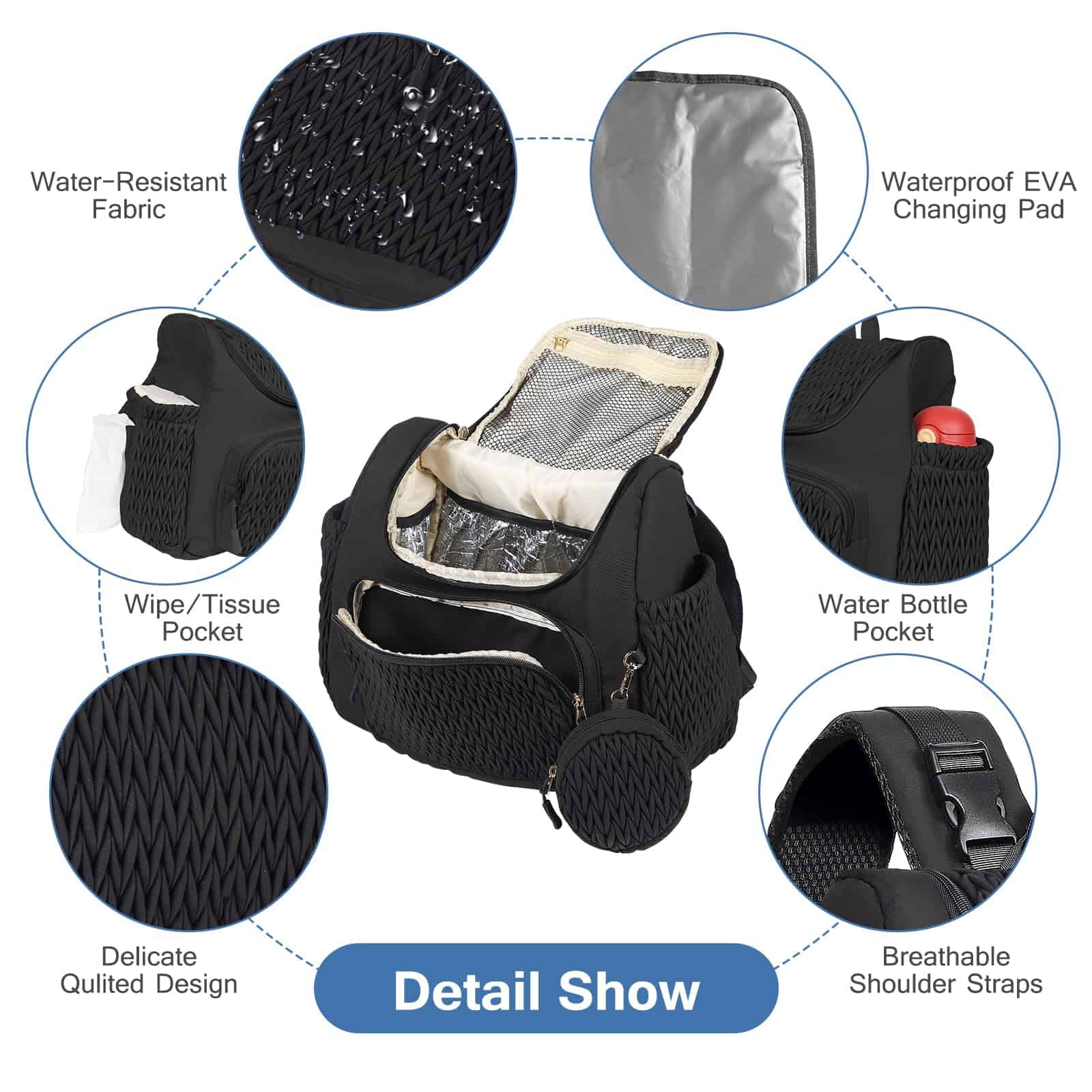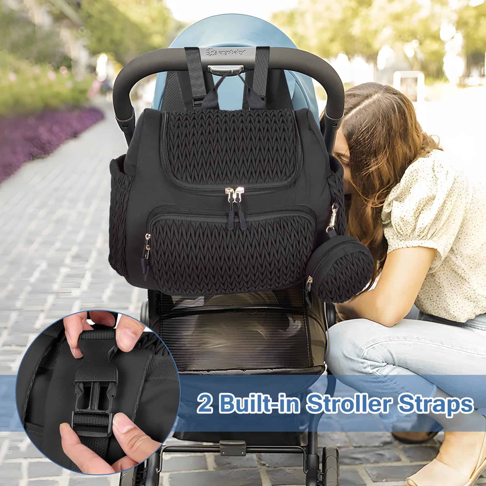 5. Cómoda y Versátil Diseñada con correas ajustables acolchadas para los hombros, esta mochila para pañales negra asegura un ajuste cómodo para madres de todas las tallas. Puede llevarse como mochila o colgarse cómodamente en un cochecito.