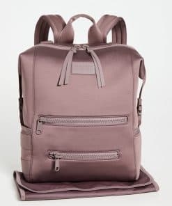 Una mochila Dagne Dover en el neopreno característico de la marca, equipada con muchas características que los nuevos padres apreciarán, como compartimentos para botellas, correas para el cochecito y un cambiador.