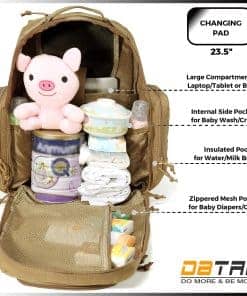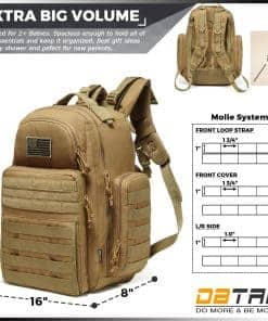 Mochila para pañales para papá, DBTAC Bolsa de pañales grande para hombres con colchoneta de cambio, bolsillos aislados + para toallitas, correas para cochecito, color beige. La mochila para pañales DBTAC (L16″xW8″xH18″) diseñada con 14 bolsillos dedicados. Te permite organizar bien todos los suministros para bebés y artículos esenciales de papá/mamá. Accesorios extra: 1x colchoneta de cambio (23.5″x14″), 1x bolsa mojada Molle con correa vertical de botón de presión (L10″xW2.5″x7″), 1x parche de bandera de EE. UU. bordado (3.1″x2.2″). Combinada con el duradero material sin PVC impermeable / artesanía de alta calidad con el práctico sistema MOLLE, esta Bolsa de pañales hará que tu hombre se sienta genial llevándola a todas partes. Cremalleras/hebillas resistentes y costuras reforzadas en todos los puntos de resistencia están diseñadas para durar. También es un regalo perfecto para el Baby Shower, Día del Padre. Dos bolsillos aislados en los lados mantienen los biberones de fórmula a la temperatura deseada. El bolsillo para toallitas permite el acceso rápido a tus necesidades instantáneas. Esta bolsa para bebés de estilo militar puede convertirse fácilmente en tu bolsa de computadora/senderismo (para portátil de 13″ o bolsa de hidratación de 2L), bolsa de viaje TOGO, o cualquier otra mochila regular. La espalda acolchada gruesa/correas para los hombros y correas adicionales para la cintura/pecho proporcionan un confort ergonómico. Las correas ajustables para cochecito y correa para equipaje están diseñadas para mantener tus manos libres. Además, puedes acceder a todo mediante un bolsillo de apertura grande y otros bolsillos de acceso fácil equipados con doble/cremallera suave sin tener que cavar. Siempre respaldamos nuestros productos DBTAC. Sólo haz más y sé más, este valor fundamental que nos impulsa a hacer un producto superior para inspirarte a hacer lo que AMAS y mejorar. Por favor, contáctanos de inmediato si encuentras algún problema de calidad y te responderemos dentro de las 12 horas. SIN RIESGO – ¿Por qué no intentarlo y AGREGARLO AL CARRITO AHORA