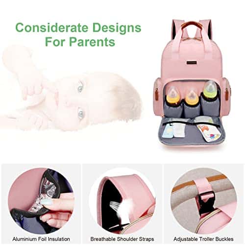 3. Bolsillos Multipropósito — Con cuatro bolsillos grandes, bolsillo para biberones en la bolsa frontal, que tiene un interior de papel de aluminio con una notable conservación del calor, para que el bebé pueda tomar leche fresca en cualquier momento al aire libre; dos bolsillos de malla de gran capacidad pueden almacenar alrededor de 8 pañales. Dos bolsillos laterales, uno para pañuelos, otro para botella de agua.