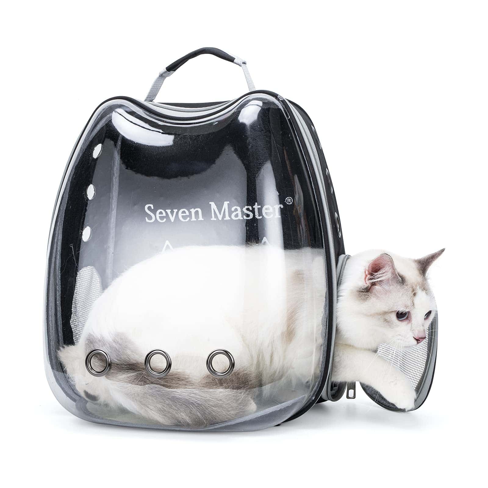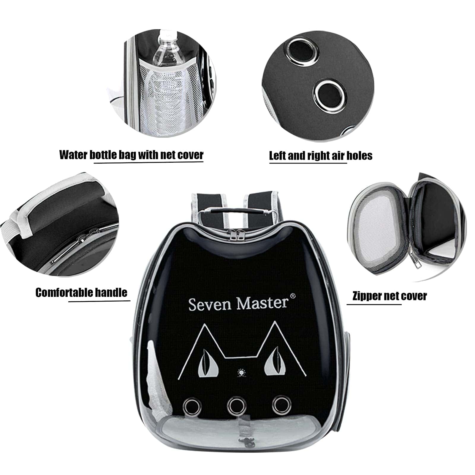 La Mochila Transportadora de Burbuja para Gatos de Seven Master es perfecta para transportar a tus mascotas de manera segura y cómoda. Su diseño de apariencia de cápsula espacial permite a tus mascotas tener una vista panorámica del mundo exterior mientras viajan. El panel hecho de PC ecológico y la parte trasera de tela Oxford garantizan durabilidad y una estructura estable. La cubierta transparente de alta densidad acrílica ofrece una excelente ventilación, con 9 ventilaciones y 2 rejillas que permiten que las mascotas respiren fácilmente. Además, cuenta con una correa de seguridad incorporada para evitar que las mascotas se escapen. Esta mochila es ideal para viajar, hacer senderismo, andar en bicicleta o cualquier otra actividad al aire libre. ¡Viaja y disfruta de la vida con tu mascota gracias a la Mochila Transportadora de Burbuja para Gatos de Seven Master!