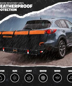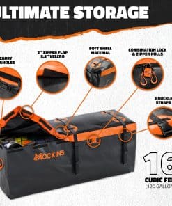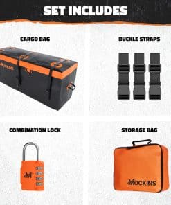 Buscar una bolsa de carga impermeable para enganche que se mantenga completamente seca durante todo el viaje. Hecho de vinilo resistente a la abrasión, nuestras bolsas suaves para vehículos Mockins están hechas para todo tipo de clima. Cremalleras con una solapa de cremallera de 2 pulgadas y 8 tiras de Velcro de 5.5″ de largo, brindan una protección de primera calidad. ¡Sin entrada de agua! Nuestras grandes bolsas de almacenamiento impermeable tienen costuras soldadas, lo que las hace duraderas también. Un viaje tranquilo con nuestra bolsa de equipaje impermeable. Lleve su transporte de equipo al siguiente nivel con nuestra confiable bolsa de carga para vehículo. Con 3 correas de carga resistentes y un juego de hebilla de carga pesada, estas garantizan un agarre apretado y estable, previniendo cualquier movimiento o que los elementos se suelten durante el tránsito. Nuestra gran bolsa impermeable en Negro/Naranja también viene con un candado de combinación naranja para mayor seguridad contra robos. ¡Pertenencias protegidas con nuestra bolsa de almacenamiento para cama de camión resistente a la intemperie! Cargue y descargue su equipo con facilidad utilizando las cremalleras envolventes de 3 lados en nuestra bolsa de carga para enganche impermeable . A diferencia de los portaequipajes duros, esta opción de almacenamiento de carga ligera y compacta se dobla ordenadamente cuando no está en uso y encaja perfectamente en la bolsa de transporte de almacenamiento naranja incluida . La fácil instalación de nuestra bolsa de carga plegable garantiza que esté en camino sin demoras. ¡Bolsa de equipaje impermeable muy conveniente para la cama de camión o el almacenamiento de remolque de rack de carga! Nosotros en Mockins apoyamos nuestros productos de bolsa de almacenamiento de camión de enganche y a nuestros maravillosos consumidores. Por lo tanto, ofrecemos una garantía limitada de 10 años en nuestro almacenamiento de carga para SUV y otros vehículos. Por favor contáctenos por cualquier inquietud. Estamos aquí para ayudarlo a resolver cualquier problema que pueda tener con nuestras bolsas de almacenamiento impermeables para cama de camión. ¡Transporte su carga con estilo y confianza con nuestro almacenamiento de carga de vehículos de enganche trasero!