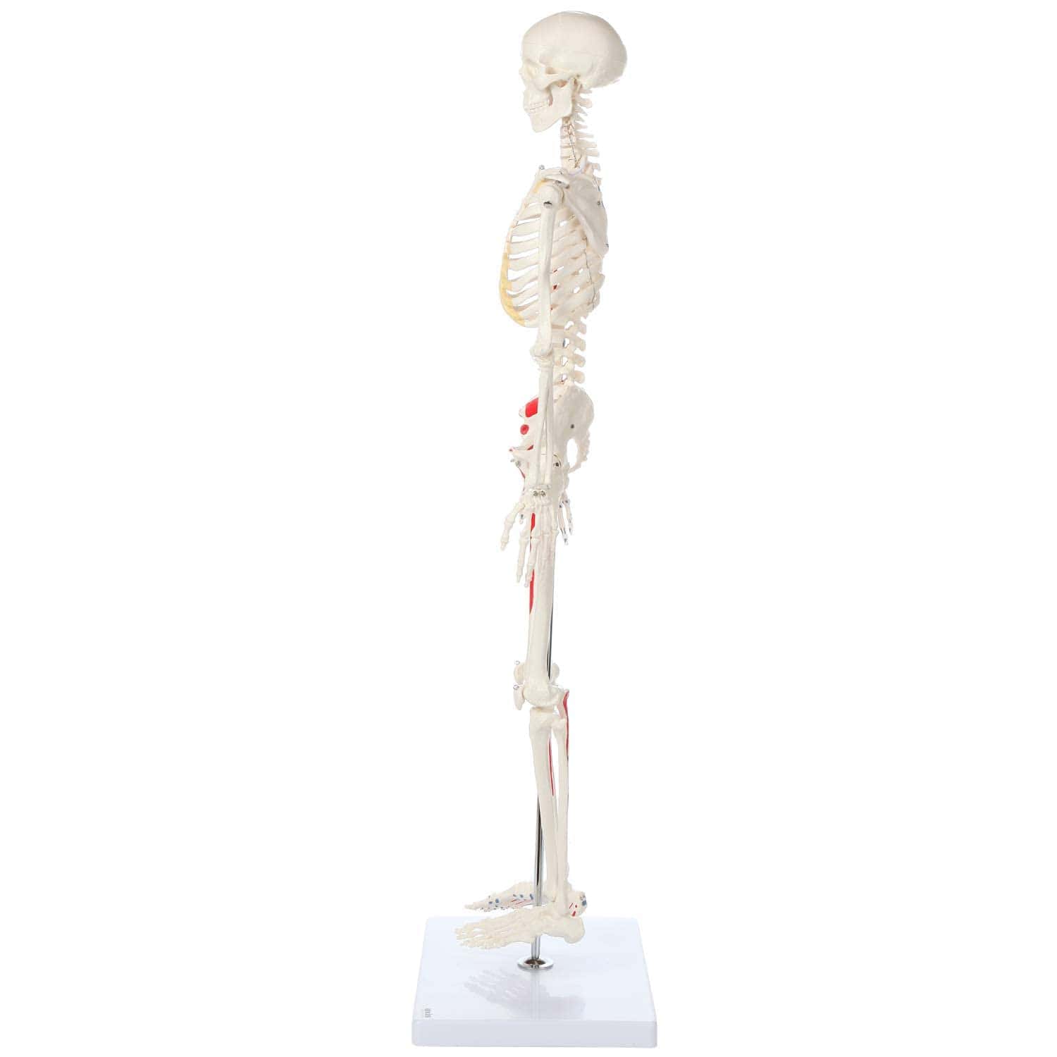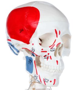Este esqueleto de tamaño 1/2 tiene la característica de detalles precisos y alta calidad. Los brazos y las piernas son móviles. El cráneo consta de 3 partes, que se pueden desmontar en: capucha, base y mandíbula inferior. Característica: El lado derecho del esqueleto muestra los puntos de origen (rojo) y los puntos de inserción (azul) de los músculos, huesos numerados a mano. Se incluye manual de referencia numérica. Tamaño: tamaño 1/2 de adulto natural, altura de 85 cm Material: PVC de alta calidad Soporte: base y soporte pesado estable, móvil
