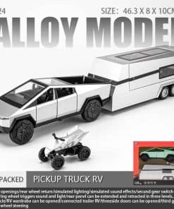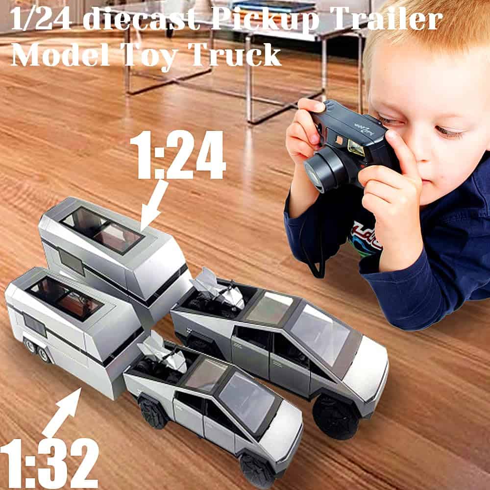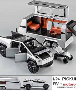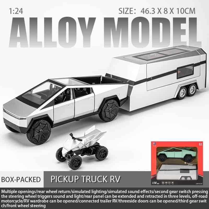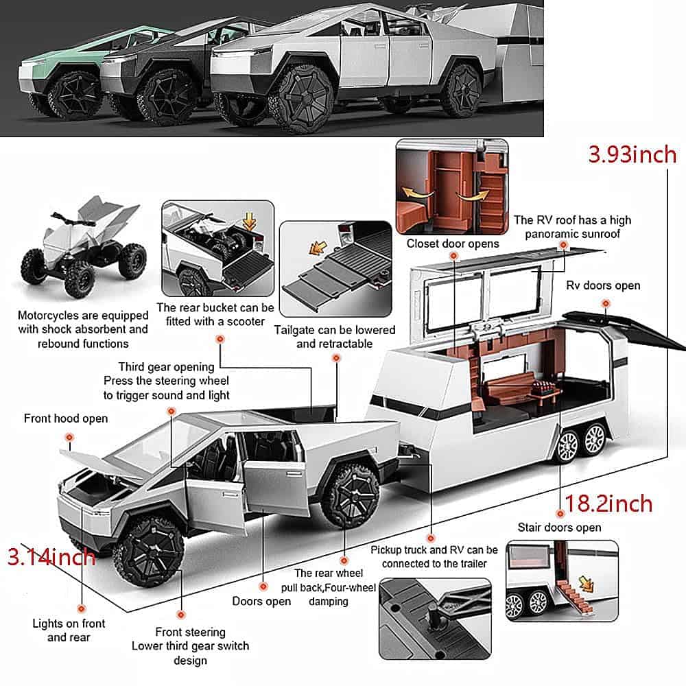 1. 1:24 modelo de camión de remolque de camiones de metal a escala 1/24, tamaño 46.3x8X10cm / 18.2×3.14 3.93 pulgadas Reproduce de manera realista la apariencia clásica de un automóvil con detalles exquisitos, haciéndote sentir como si tuvieras una versión en miniatura del coche del futuro. Este conjunto de modelos viene con un exquisito remolque RV, lo que le permite combinar la camioneta con el RV para construir su propia mini escena de camping futurista y comenzar una experiencia de viaje única.