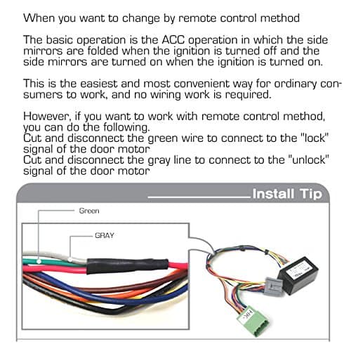 La operación básica es la operación ACC en la que los espejos laterales se pliegan cuando se apaga el encendido y los espejos laterales se encienden cuando se enciende el encendido.Esta es la forma más fácil y conveniente para que las personas trabajen, y no se requiere trabajo de cableado.