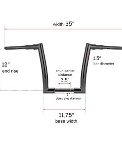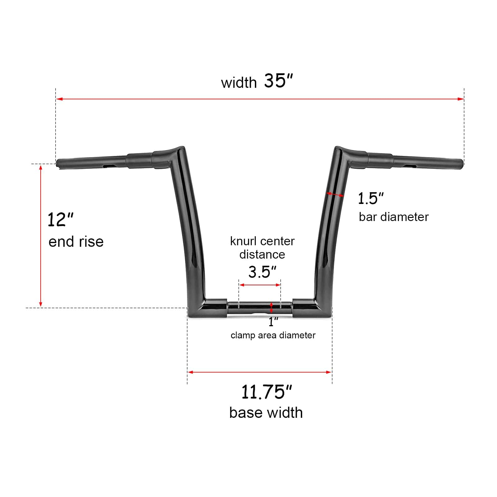 Bar Diameter: 1.5 inch Fat Bar. Center Width: 11.75 inch, Clamp Area Width: 5.4 inch & Diameter: 1 inch. Grip Area Bar Diameter: 1 inch. End Rise: 12 inch. Overall Width: 35 inch. Pullback/Sweep: 8 inch. Material: Seamless steel line pipe (Much Stronger than other’s Straight Seam Welded pipe handlebar on the market) Finish: Powder Coated Black(Copper, Nickle, Black), High Standard Rust-Proof Plating which can be tested by salt spray 48 hours neutral. Pre-Drilled: Yes. Package Including: 1x Handlebar.
