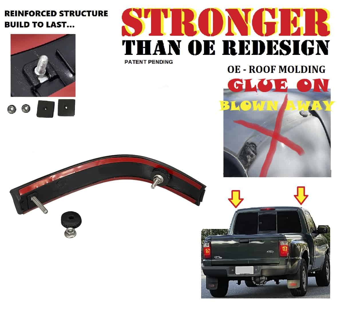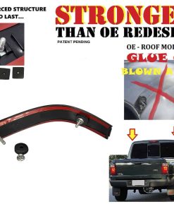 Marca nueva Moldura de techo mejorada Set de 2 piezas para Ford Ranger 98-11. Las molduras originales se montaron con dos pernos y tuercas y un parche de pegamento debajo. Con el tiempo, con temperaturas extremas de calor bajo el sol, el pegamento se ha desintegrado y la moldura se agrietó y voló con las tuercas aún adheridas.
