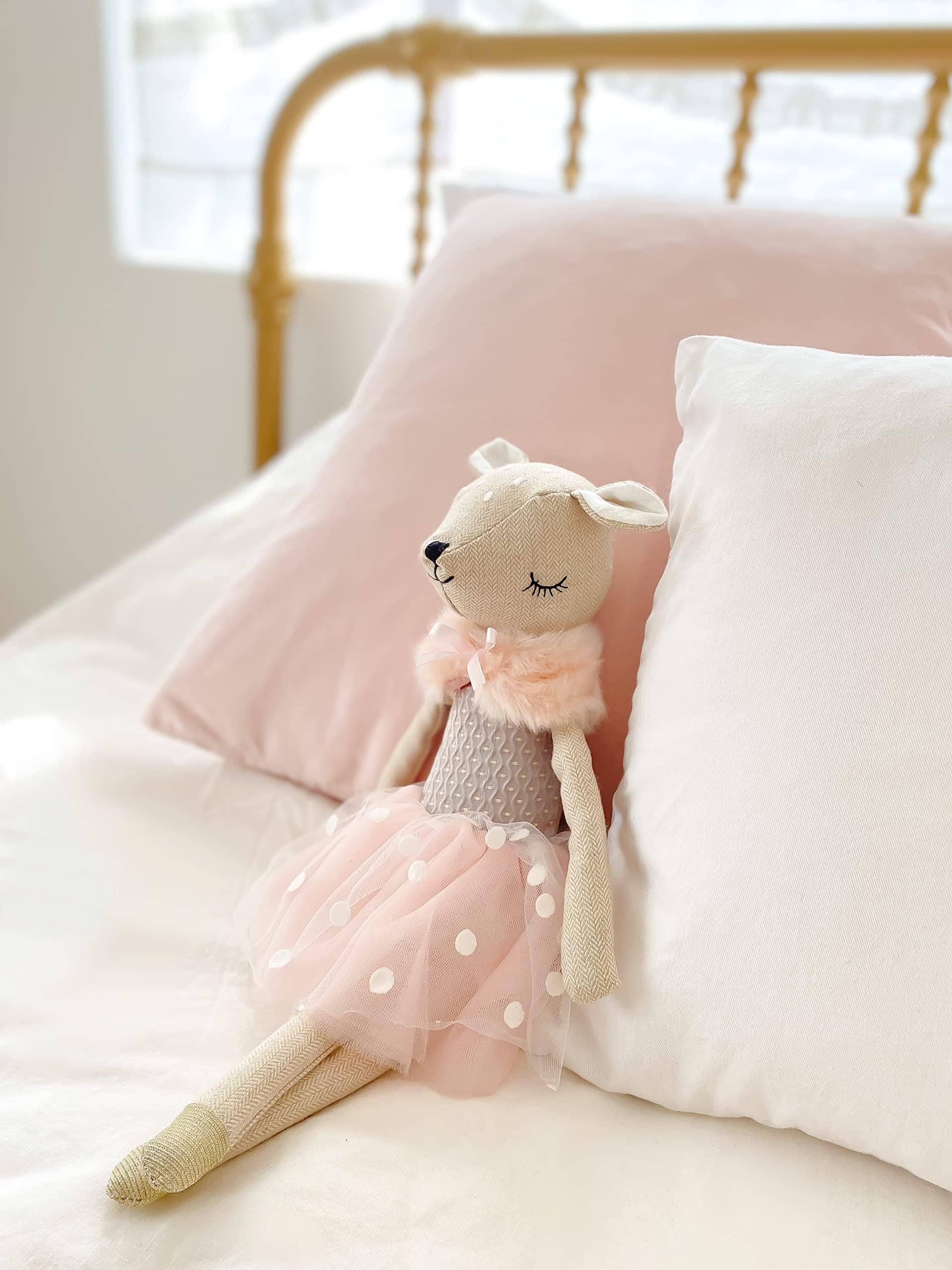 La muñeca viene con un vestido de tul rosa, y un delicado chal alrededor del cuello. Están construidos con materiales de alta calidad y una excelente artesanía, lo que los hace ideales para los niños y sus habitaciones.