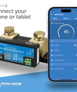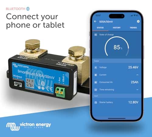 El SmartShunt es un monitor de batería todo en uno, solo que sin display. Tu teléfono actúa como un display. El SmartShunt se conecta a la app VictronConnect en tu teléfono (o tableta) a través de Bluetooth y puedes leer cómodamente todos los parámetros de la batería monitorizados, como el estado de carga, tiempo restante, información histórica y mucho más.
