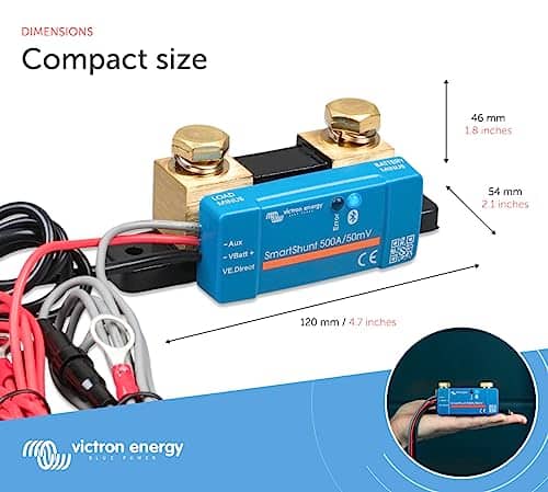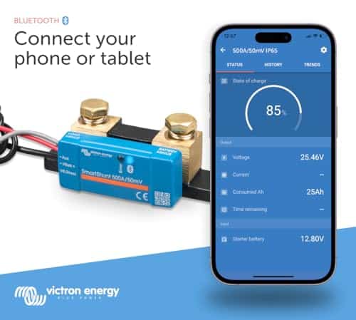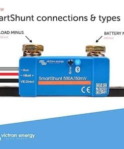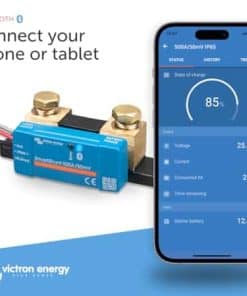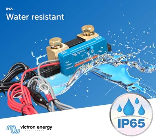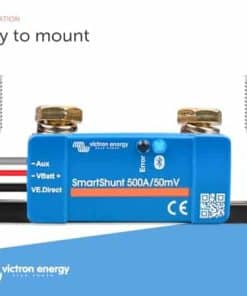 El monitor de batería Victron Energy SmartShunt IP65 es un monitor de batería todo en uno, solo que sin pantalla. Su teléfono actúa como la pantalla. El monitor de batería Victron Energy SmartShunt IP65 se conecta a través de Bluetooth a la aplicación VictronConnect en su teléfono (o tableta) y puede leer convenientemente todos los parámetros de la batería monitoreados, como el estado de carga, tiempo restante, información histórica y mucho más. Alternativamente, el SmartShunt IP65 se puede conectar y ser leído por un dispositivo Victron Energy GX. La conexión al monitor de batería Victron Energy SmartShunt se realiza a través de un cable VE.Direct. El monitor de batería Victron Energy SmartShunt IP65 es una buena alternativa para un monitor de batería Victron Energy BMV, especialmente para sistemas donde se necesita monitoreo de batería pero se desea menos cableado y desorden. El monitor de batería Victron Energy SmartShunt IP65 está equipado con Bluetooth, tiene un puerto VE.Direct y una conexión auxiliar que se puede usar para monitorear una segunda batería, para monitores de punto medio o para conectar un sensor de temperatura. El monitor de batería Victron Energy SmartShunt IP65 es resistente al agua y está disponible en una versión de 500 amperios, 1000 amperios o 2000 amperios.