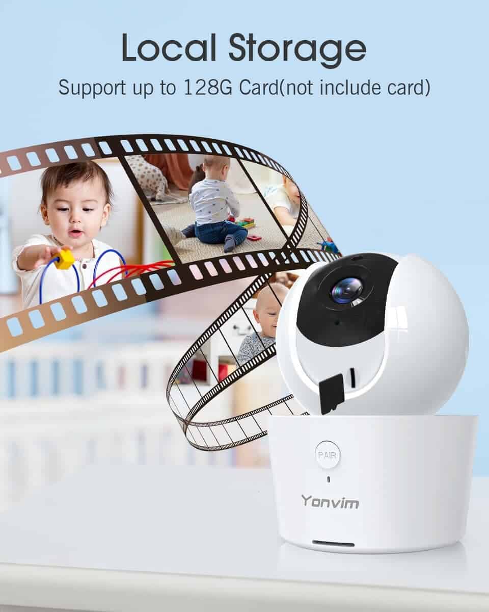 4. Grabación de memoria El monitor de bebé Yonvim admite almacenamiento local (hasta tarjeta de 128GB) para grabar momentos preciosos. Nota: La ranura para tarjeta está en el cuerpo de la cámara, debajo de la lente de la cámara.