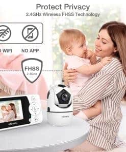 2. Conexión inalámbrica segura: Di adiós a las preocupaciones de Wi-Fi. Esta cámara de bebé utiliza la avanzada tecnología FHSS de 2.4GHz, ofreciendo una conexión estable y segura. Descanse tranquilo sabiendo que la privacidad de su bebé está bien protegida.