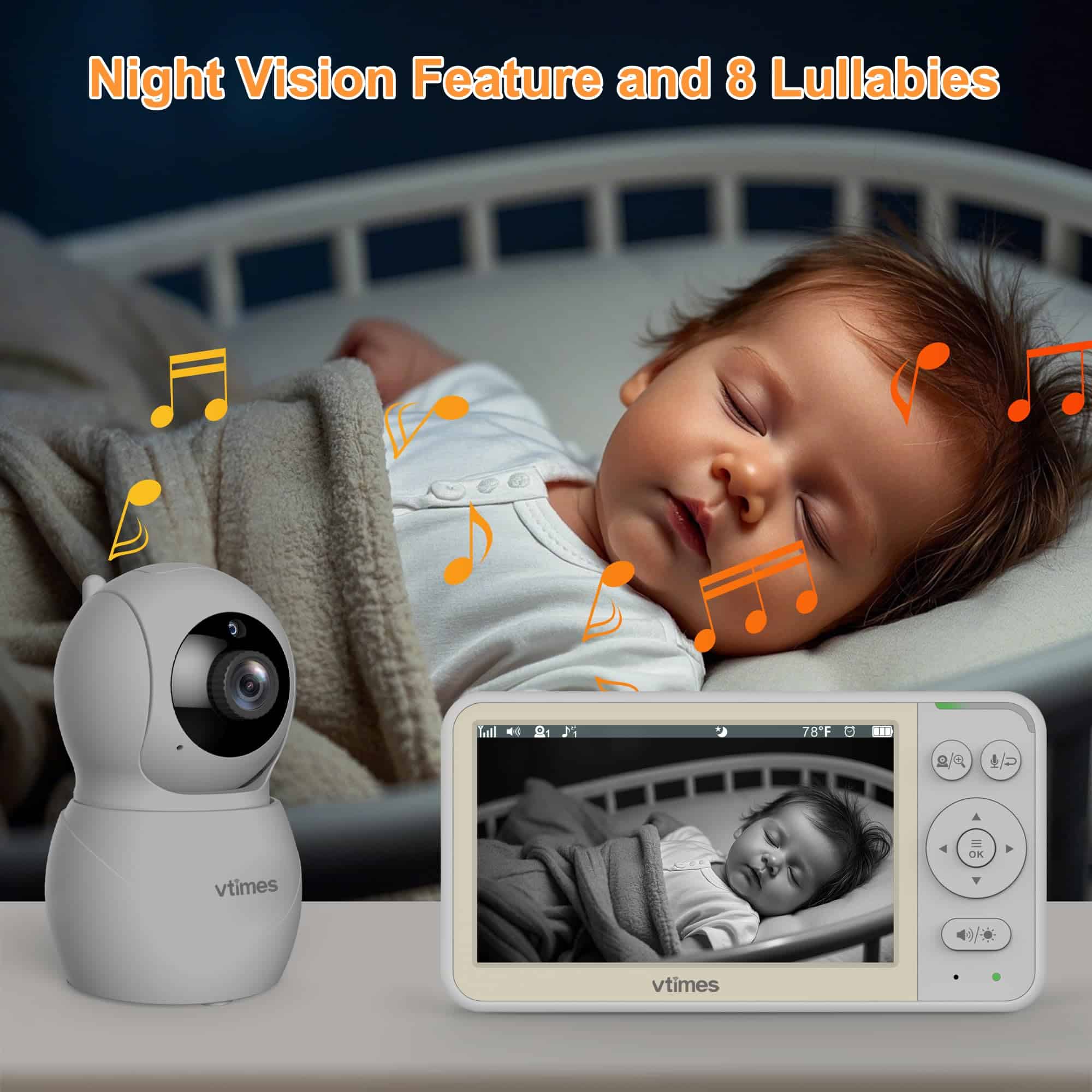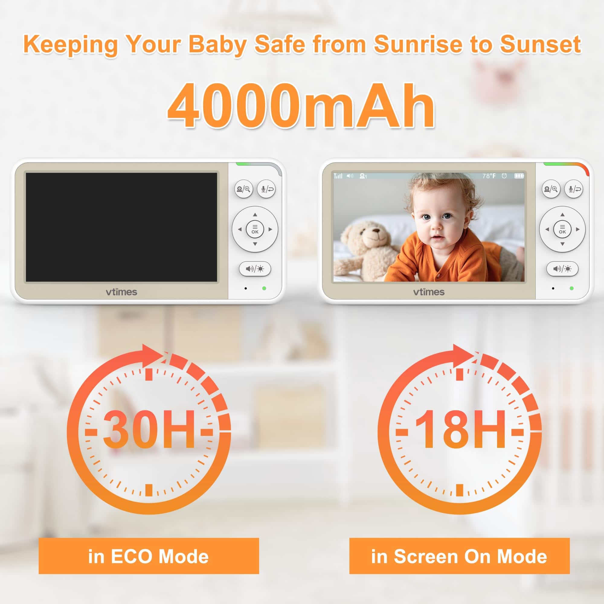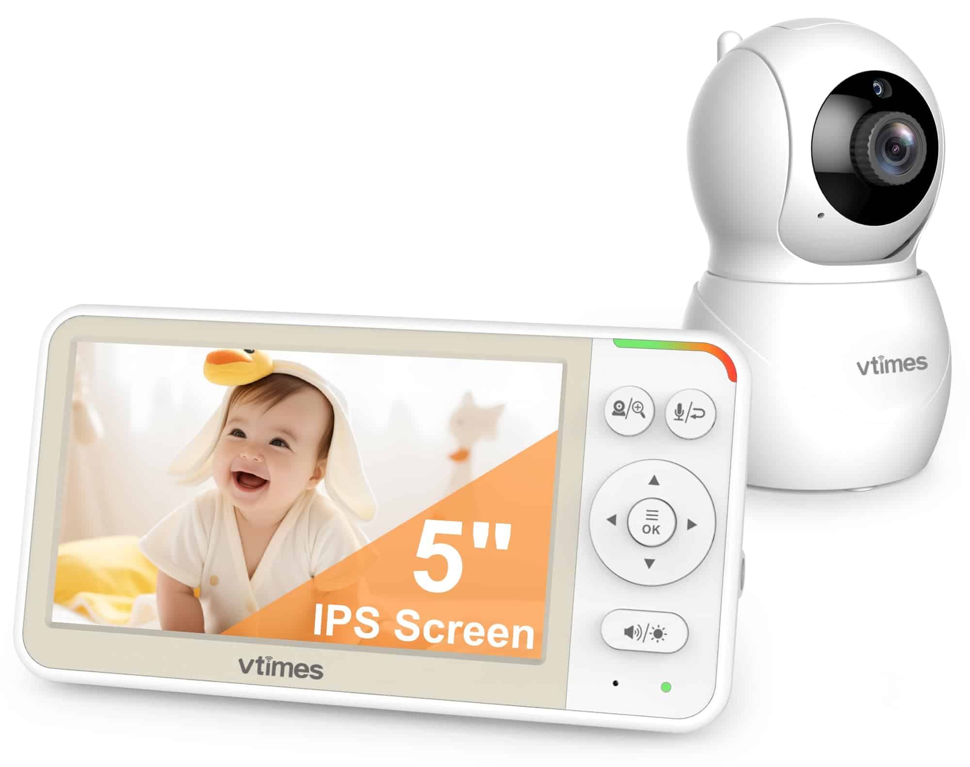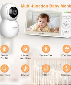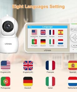 Monitor de Bebé de Video VTimes 5» Sin WiFi con Batería de 32 Horas, Cámara de Bebé de 2 Vías con VOX Pan-Tilt-Zoom Visión Nocturna de Temperatura Alarma 8 Canciones de Cuna y 1000ft La pantalla clara IPS de 5″: Experimenta una vista cristalina en la generosa pantalla IPS de 5 pulgadas de nuestro monitor de bebé. Con alta resolución y tecnología IPS avanzada, cada detalle es visible con una claridad impresionante. Además, nuestro monitor de bebé sin wifi garantiza que tu seguridad y privacidad estén totalmente protegidas. Batería de larga duración: Nuestro monitor de bebé de video cuenta con una batería robusta de 4000mAh, proporcionando un uso prolongado para un monitoreo ininterrumpido. En modo ECO, puede durar hasta 30 horas, mientras que el modo de encendido de la pantalla ofrece hasta 18 horas de funcionamiento continuo. Día o noche, sirve como tu fiel guardián para la seguridad de tu bebé. Función VOX inteligente: Nuestra cámara de monitor de bebé está equipada con tres niveles de sensibilidad: bajo, medio y alto. Con la configuración de alta sensibilidad, detecta incluso los sonidos más tenues de tu bebé, asegurando un monitoreo exhaustivo y priorizando la seguridad de tu hijo. Funciones inteligentes: Nuestro monitor de bebé para viajar ofrece varias funciones convenientes. Esta cámara de bebé te asegura que siempre estás conectado, desde canciones de cuna relajantes y monitoreo de temperatura hasta recordatorios de alimentación, conversación bidireccional y visión nocturna infrarroja. Además, con la funcionalidad de Pan-Tilt-Zoom automático, vigilar a tu pequeño nunca ha sido tan fácil. Conectar y Listo: Nuestro monitor de bebé con cámara y audio cuenta con una configuración fácil de conectar y listo para tu comodidad. ¡Simplemente conecta el monitor y la cámara, y ya está! Con visión nocturna automática, puedes disfrutar de una visibilidad clara incluso en condiciones de poca luz. Si tienes alguna pregunta, no dudes en comunicarte