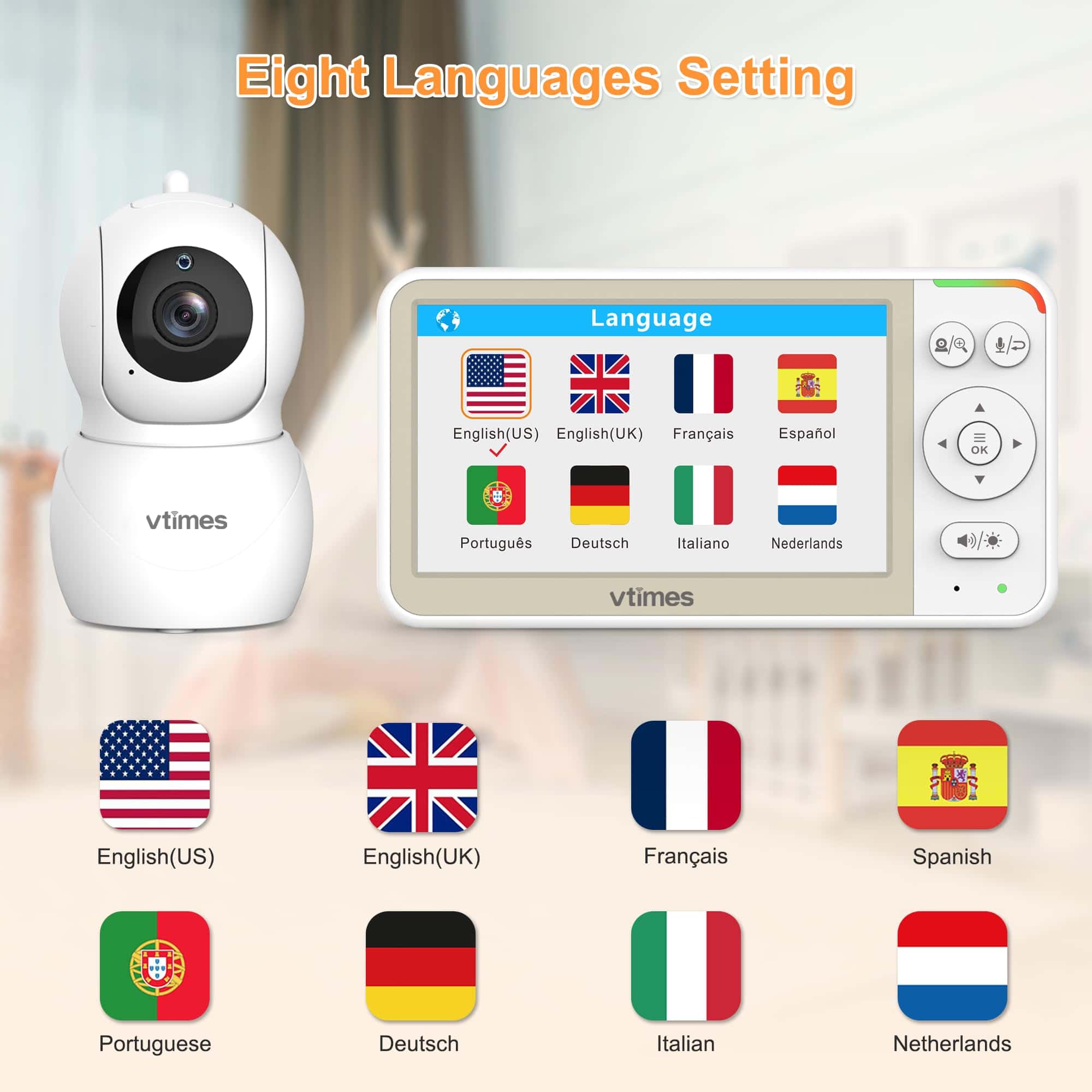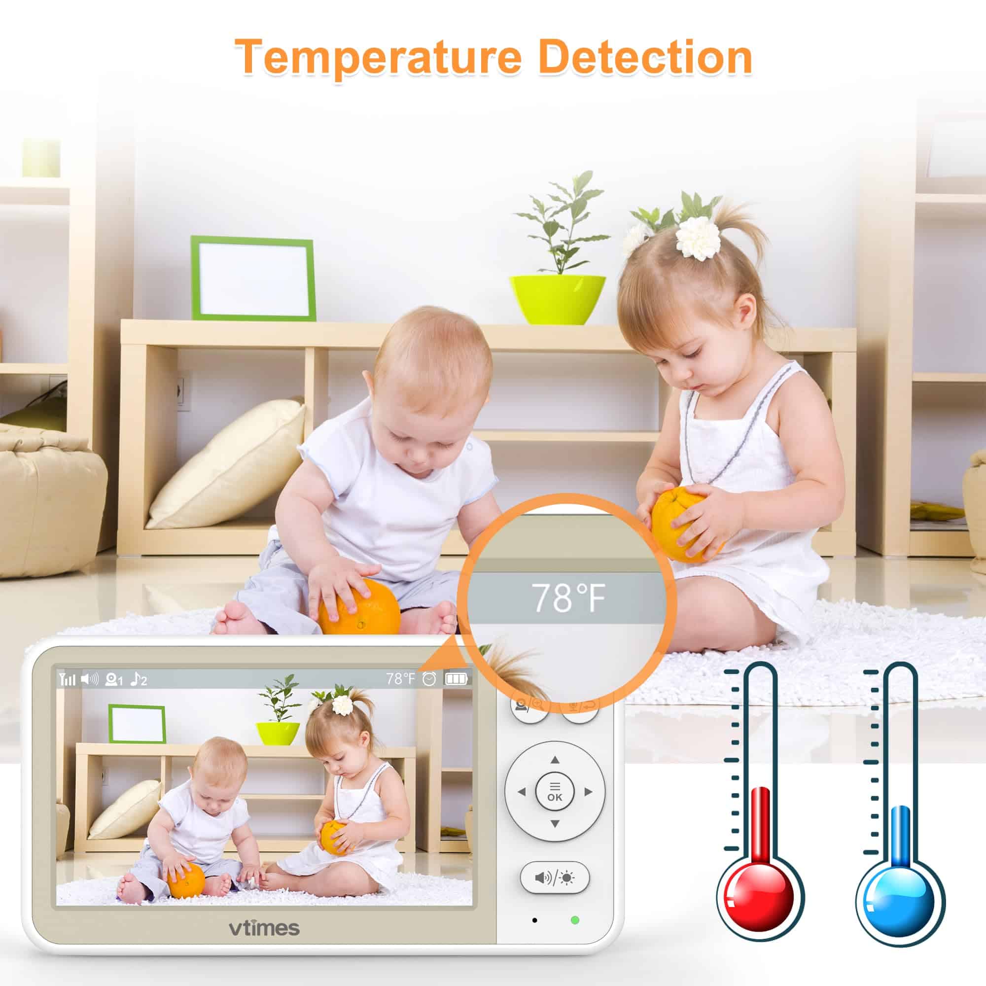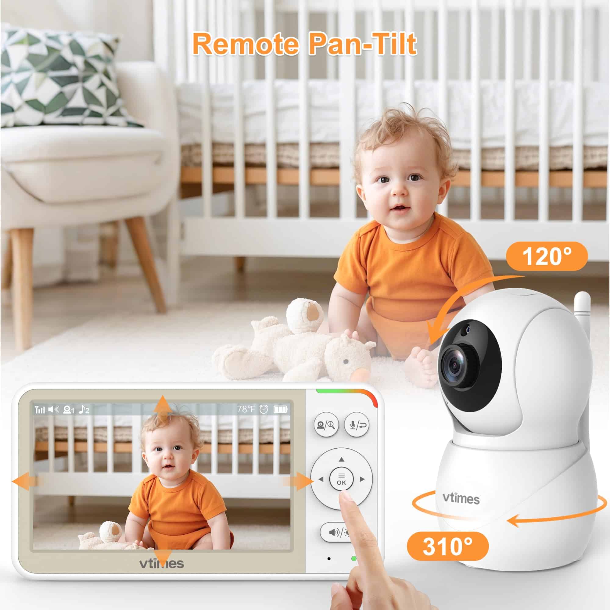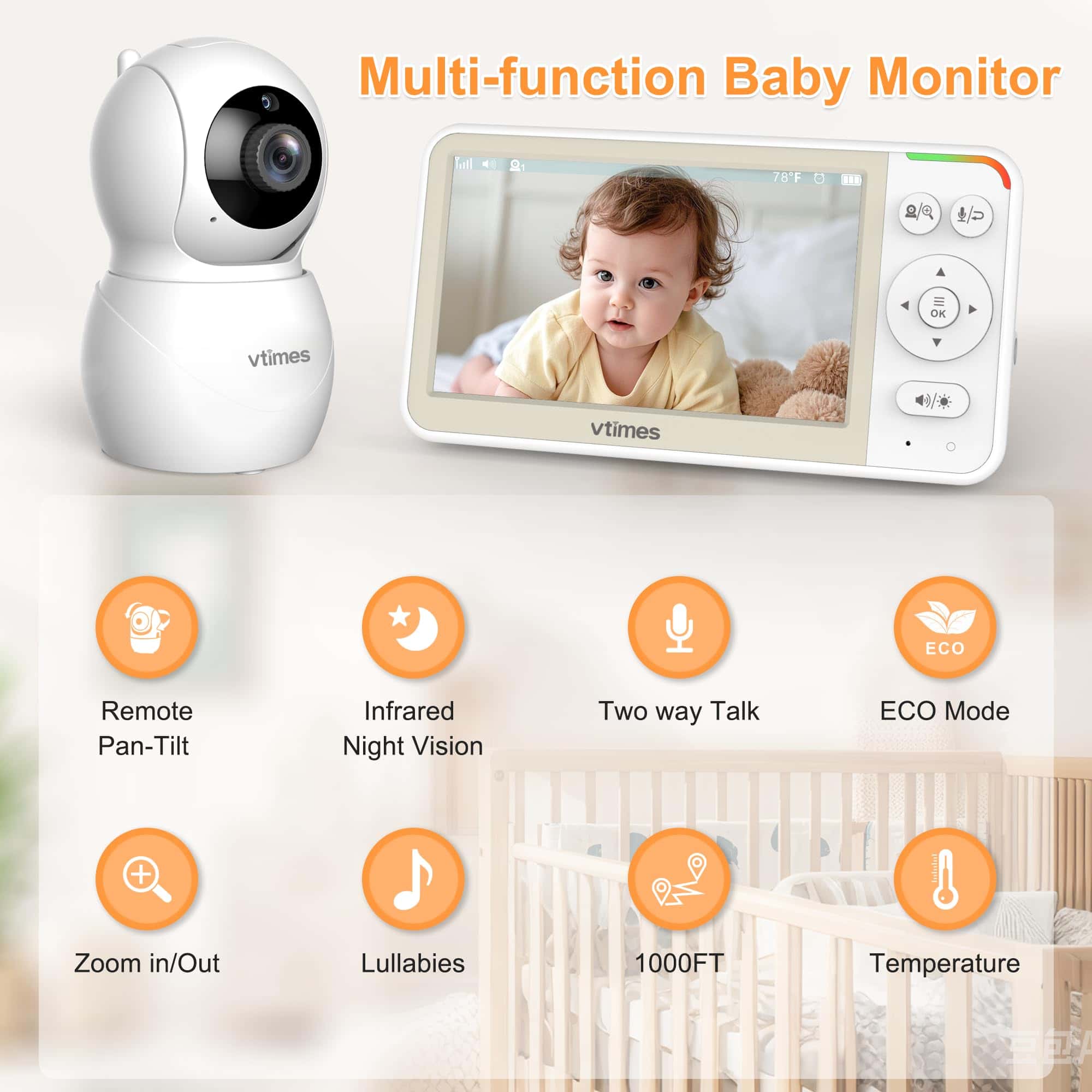 Monitor de Bebé de Video VTimes 5» Sin WiFi con Batería de 32 Horas, Cámara de Bebé de 2 Vías con VOX Pan-Tilt-Zoom Visión Nocturna de Temperatura Alarma 8 Canciones de Cuna y 1000ft La pantalla clara IPS de 5″: Experimenta una vista cristalina en la generosa pantalla IPS de 5 pulgadas de nuestro monitor de bebé. Con alta resolución y tecnología IPS avanzada, cada detalle es visible con una claridad impresionante. Además, nuestro monitor de bebé sin wifi garantiza que tu seguridad y privacidad estén totalmente protegidas. Batería de larga duración: Nuestro monitor de bebé de video cuenta con una batería robusta de 4000mAh, proporcionando un uso prolongado para un monitoreo ininterrumpido. En modo ECO, puede durar hasta 30 horas, mientras que el modo de encendido de la pantalla ofrece hasta 18 horas de funcionamiento continuo. Día o noche, sirve como tu fiel guardián para la seguridad de tu bebé. Función VOX inteligente: Nuestra cámara de monitor de bebé está equipada con tres niveles de sensibilidad: bajo, medio y alto. Con la configuración de alta sensibilidad, detecta incluso los sonidos más tenues de tu bebé, asegurando un monitoreo exhaustivo y priorizando la seguridad de tu hijo. Funciones inteligentes: Nuestro monitor de bebé para viajar ofrece varias funciones convenientes. Esta cámara de bebé te asegura que siempre estás conectado, desde canciones de cuna relajantes y monitoreo de temperatura hasta recordatorios de alimentación, conversación bidireccional y visión nocturna infrarroja. Además, con la funcionalidad de Pan-Tilt-Zoom automático, vigilar a tu pequeño nunca ha sido tan fácil. Conectar y Listo: Nuestro monitor de bebé con cámara y audio cuenta con una configuración fácil de conectar y listo para tu comodidad. ¡Simplemente conecta el monitor y la cámara, y ya está! Con visión nocturna automática, puedes disfrutar de una visibilidad clara incluso en condiciones de poca luz. Si tienes alguna pregunta, no dudes en comunicarte