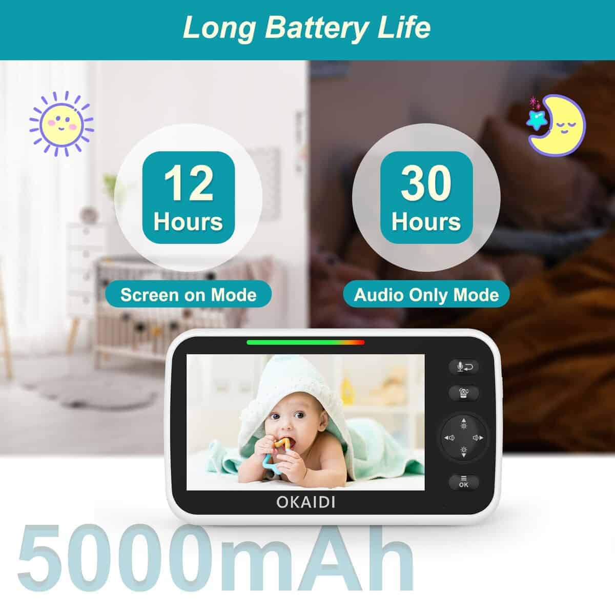 1. Pantalla de 5 Pulgadas con Resolución de 720P: El Monitor de Bebé OKAIDI cuenta con una pantalla HD de 720P y una gran pantalla de 5 Pulgadas, entregando imágenes claras y nítidas con un amplio campo de visión. Esto le permite capturar fácilmente cada detalle de su bebé y estar siempre al tanto de sus actividades, brindándole auténtica tranquilidad y comodidad. 2. Monitor de Bebé Seguro: El Monitor de Bebé utiliza tecnología 2.4GHz FHSS, con una fuerte capacidad anti-interferencias y una señal estable, cubriendo un rango de aproximadamente 1000 pies. No necesita conexión WiFi ni descarga de aplicaciones. Esta tecnología está fuertemente protegida contra ataques de hackers y ofrece protección integral de la privacidad y seguridad de los bebés. 3. Visión Nocturna Infrarroja y Ángulo de Visión Ajustable de Forma Remota: Nuestro Monitor de Bebé adopta tecnología de visión nocturna infrarroja para garantizar una monitorización clara de las actividades de su bebé en condiciones de oscuridad. La cámara soporta ajuste horizontal de 120 y vertical de 288, y está equipada con una función de zoom de 3X para asegurarse de que su hijo esté siempre a la vista. 4. Vida Útil de Batería Duradera: La batería de 5000mAh se destaca por su excepcional larga duración, permitiendo un uso continuo de hasta 12 horas con la pantalla encendida, asegurando una monitorización ininterrumpida sin necesidad de cargar frecuentemente. En modo de audio, ofrece hasta 30 horas de vida útil de la batería, brindando conveniencia y tranquilidad en su viaje de crianza. 5. Mostrar la Hora y Comunicación Bidireccional: Este monitor de bebé combina la comunicación bidireccional con funciones de visualización de la hora, lo que no solo permite a las madres escuchar e interactuar de cerca con sus bebés en tiempo real, sino que también muestra la hora actual en la pantalla, brindándole una sensación completa de tranquilidad.