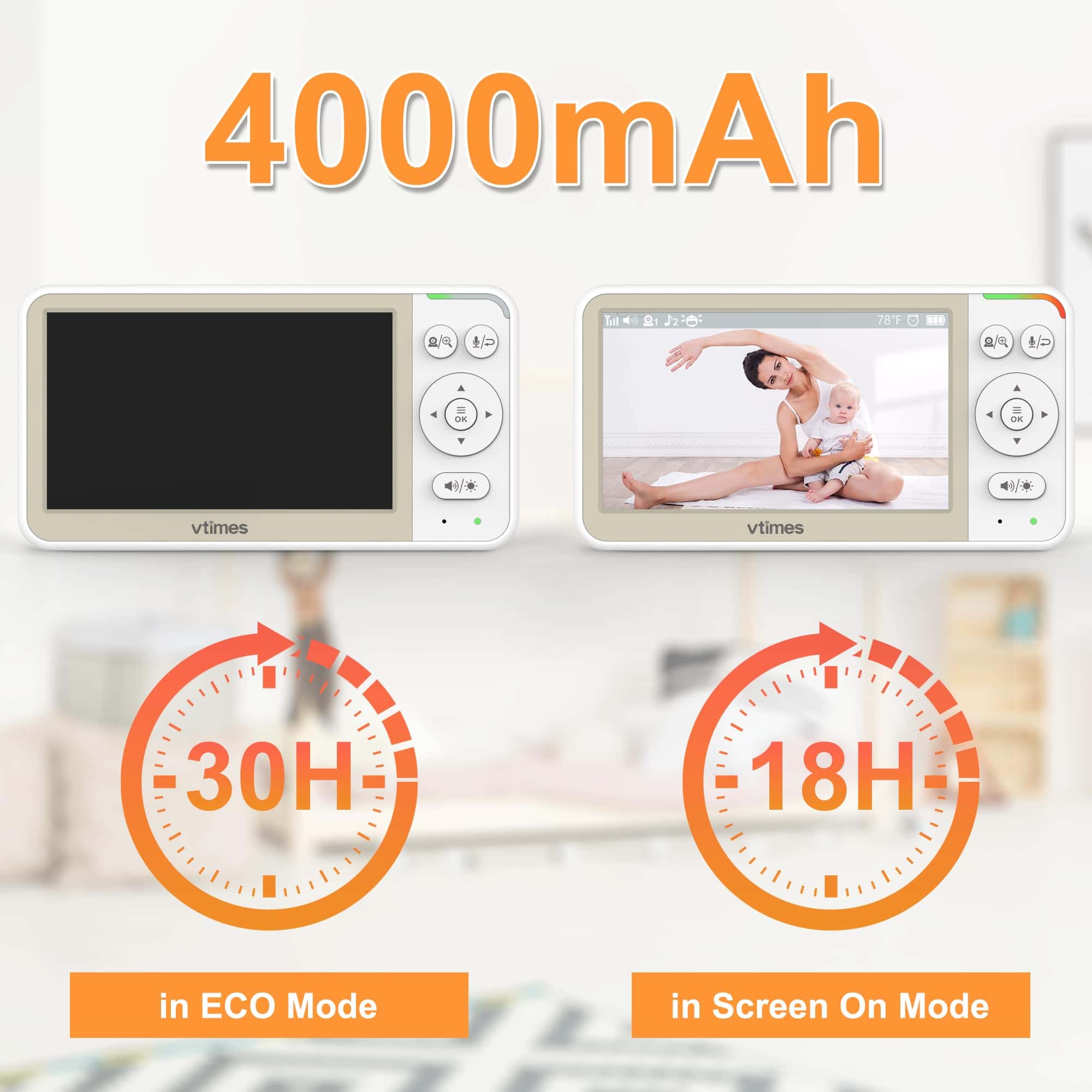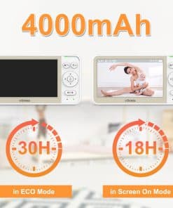 2. Batería de larga duración Equipado con una potente batería de 4000mAh, nuestro monitor de bebé con video garantiza un tiempo de uso prolongado para una monitorización ininterrumpida. En modo ECO, la batería puede durar hasta 30 horas, mientras que el modo de pantalla encendida puede mantener hasta 18 horas de funcionamiento continuo. Día y noche, es su confiable guardián para la seguridad de su bebé.
