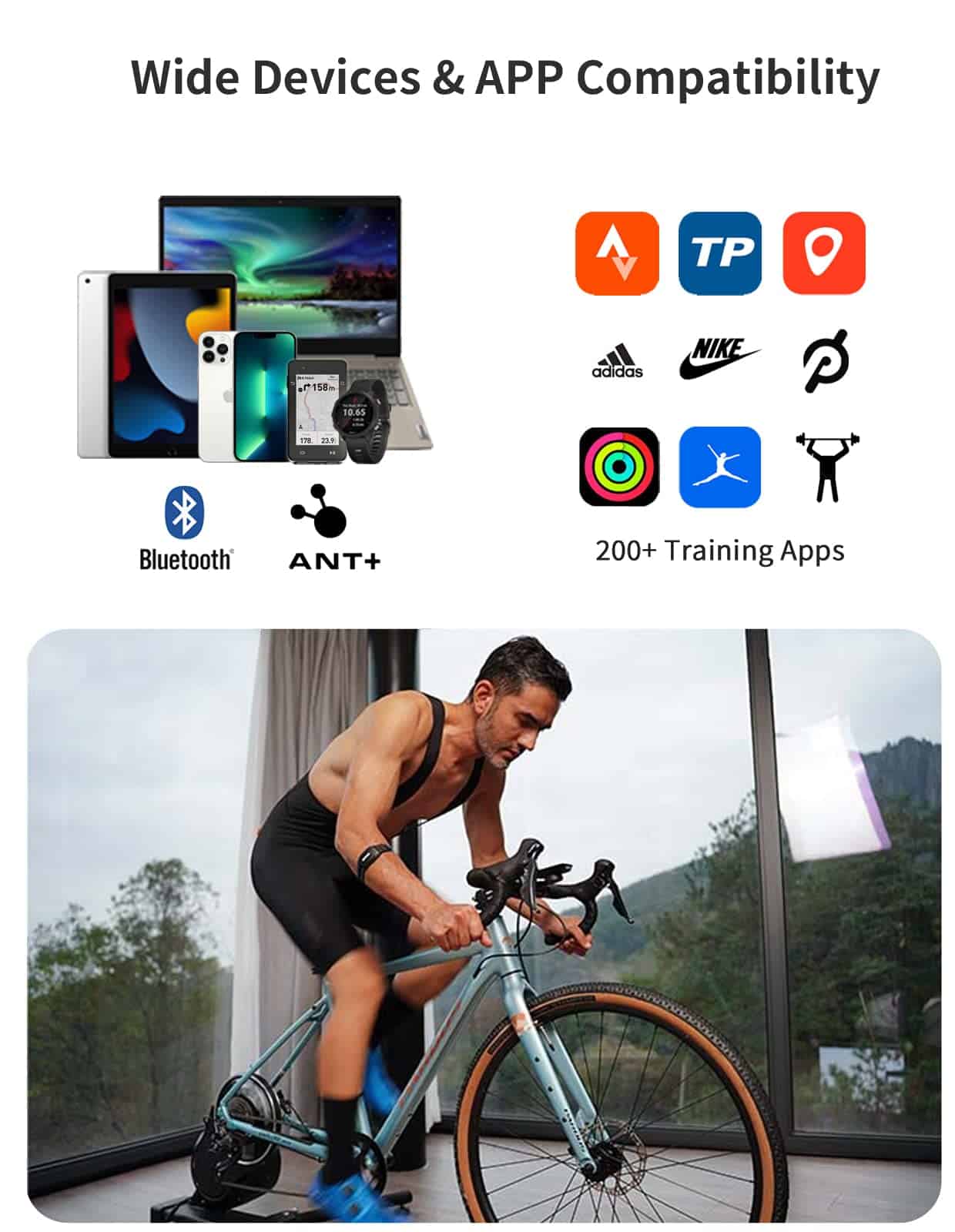 3. Compatible con el 99% de los dispositivos: Bluetooth 5.0 y ANT+ garantizan que pueda conectarse al 99% de los dispositivos electrónicos en el mercado. El monitor de frecuencia cardíaca es compatible con más de 200 aplicaciones como Wahoo Fitness/Strava/Polar Beat/DDP Yoga/HR monitor/CooSporide.
