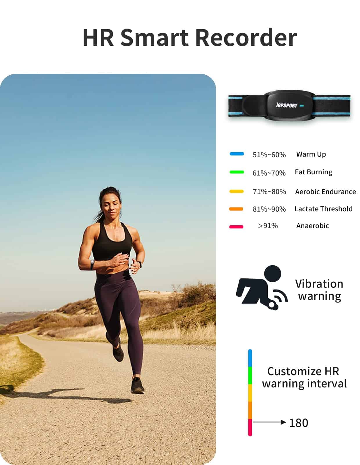 4. Monitoreo de zonas de frecuencia cardíaca: El HR70 puede monitorear zonas de frecuencia cardíaca a través de luces LED de diferentes colores y tiene recordatorios de vibración y funciones de zona de frecuencia cardíaca personalizadas, lo que le permite comprender su estado de ejercicio de manera más intuitiva.