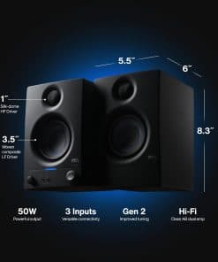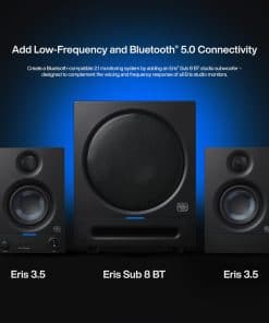 Monitores de estudio Eris 3.5 de campo cercano que ofrecen un sonido de calidad de estudio, perfecto para producción musical, escucha de audio de alta fidelidad o referencia multimedia. Con 50W de potencia de Clase AB a bordo, disfrutarás de un audio fuerte y claro, sin distorsión.