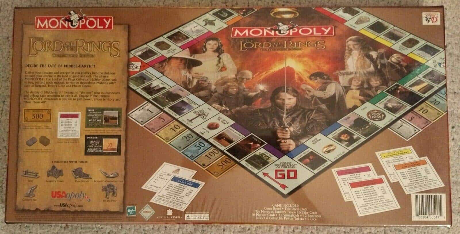 Decide el destino de la Tierra Media. Reúne tu coraje y fuerza mientras te adentras en la oscuridad para construir tu imperio en la tierra del bien y del mal. La nueva edición de coleccionista de MONOPOLY: El Señor de los Anillos te permite comprar, vender e intercambiar estratégicos territorios en toda la Tierra Media como Isengard, el Abismo de Helm y el Monte del Destino. El destino de la Tierra Media pertenece al que logre superar y derrotar a cada oponente para poseerlo todo. Todos los componentes, incluyendo hermosas fotografías de la película y 6 fichas coleccionables de metal, te permiten participar en la batalla final de MONOPOLY mientras compites por obtener poder, acumular territorio y gobernarlos a todos.