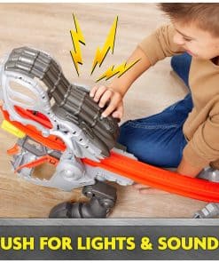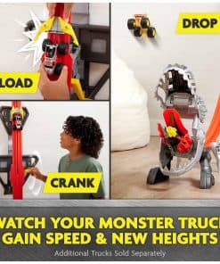 Pon las acrobacias de Monster Jam en tus manos con el Monster Jam ThunderROARus Drop Playset. Con una altura de 6 pies, este es el set de juego de Monster Jam más alto hasta ahora. Carga tu camión Monster Jam y gira la manivela para ver cómo gana altura. Obsérvalo liberarse en la parte superior y realizar tres increíbles acrobacias de Monster Jam como un salto alto, voltereta frontal y sacacorchos a medida que sale de la boca del Dino. La cabeza del Dino cobra vida con luces y sonidos. Observa cómo la caída vertical impulsa tu juguete de coche a nuevas alturas. Este set viene con un camión ThunderROARus exclusivo en escala de 1:64. Tiene espacio para 4 camiones adicionales en la base para que estén listos para la acción (se venden por separado). El montaje del set de juego es muy sencillo y se adhiere de forma segura a la pared a través de las tiras de 3M Command Strips. Ajusta, carga y gira tus juguetes de camión monstruo para disfrutar de mucha diversión de Monster Jam. Utiliza el embalaje como plantilla para configurar este set de juego en la pared. La rampa de aterrizaje incluida te permitirá empezar a disfrutar de las emociones de ThunderROARus Drop. Con tantos otros camiones de Monster Jam para coleccionar, añade a Grave Digger, Max-D, El Toro Loco y más (cada uno se vende por separado) a tu colección y compite con todos ellos. Los juguetes de Monster Jam, como coches y camiones de control remoto, son los regalos perfectos como juguetes para niñas y niños a partir de 3 años. Sumérgete en la acción de Monster Jam con el ThunderROARus Drop Playset.