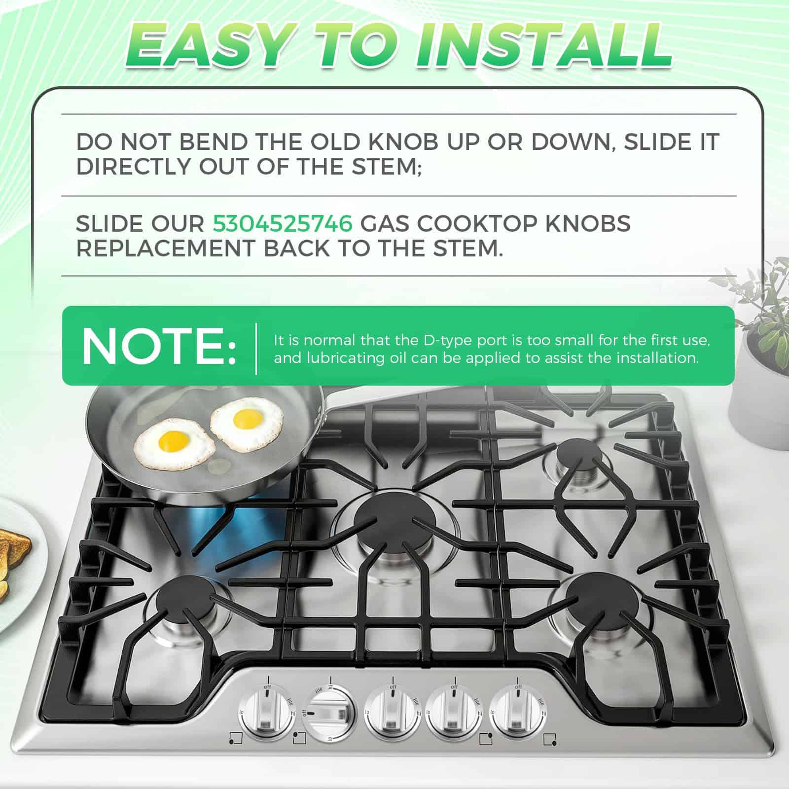 3. FÁCIL DE INSTALAR: Estas perillas de estufa FFGC3026SS de repuesto para Frigidaire tienen un anillo de metal interior «D» reforzado. En el proceso de reemplazar las perillas, no doble la perilla vieja hacia arriba o hacia abajo, deslícela directamente fuera del vástago y vuelva a deslizar nuestras perillas de repuesto para la estufa 5304525746 al vástago. Es normal que el puerto tipo D sea demasiado pequeño para el primer uso, y se puede aplicar aceite lubricante para ayudar en la instalación.