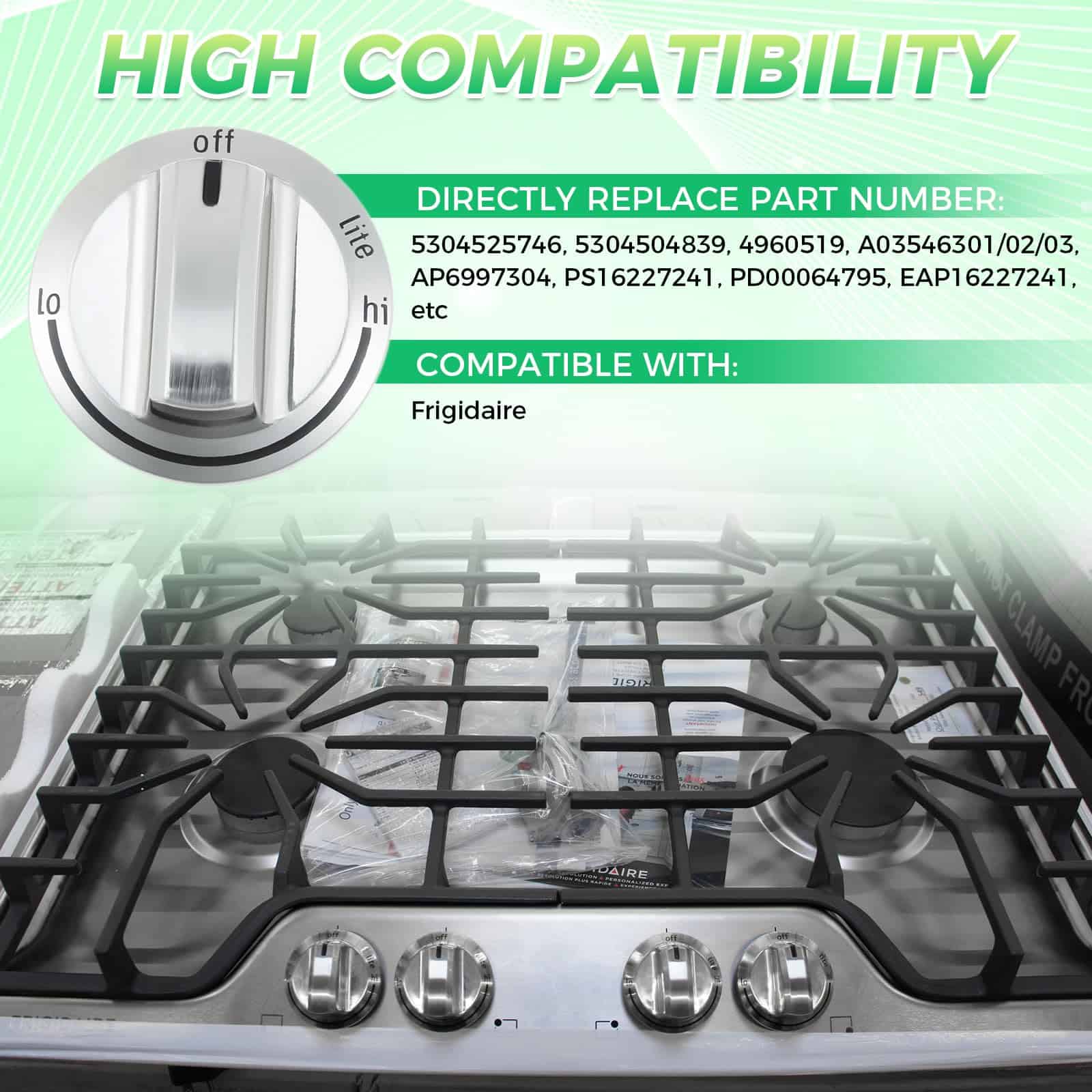 2. ALTA COMPATIBILIDAD: Nuestras perillas de estufa de gas de repuesto para Frigidaire pueden reemplazar el número de parte: 5304504839, 4960519, AP6997304, PS16227241, EAP16227241, etc, y son compatibles con los modelos de cocinas de rango Frigidaire: FFGC3026SBC, FFGC3026SSA, FFGC3026SSB, FFGC3026SSC, FFGC3026SSD, FFGC3026SSE, FFGC3626SSA, FFGC3626SSB, etc.