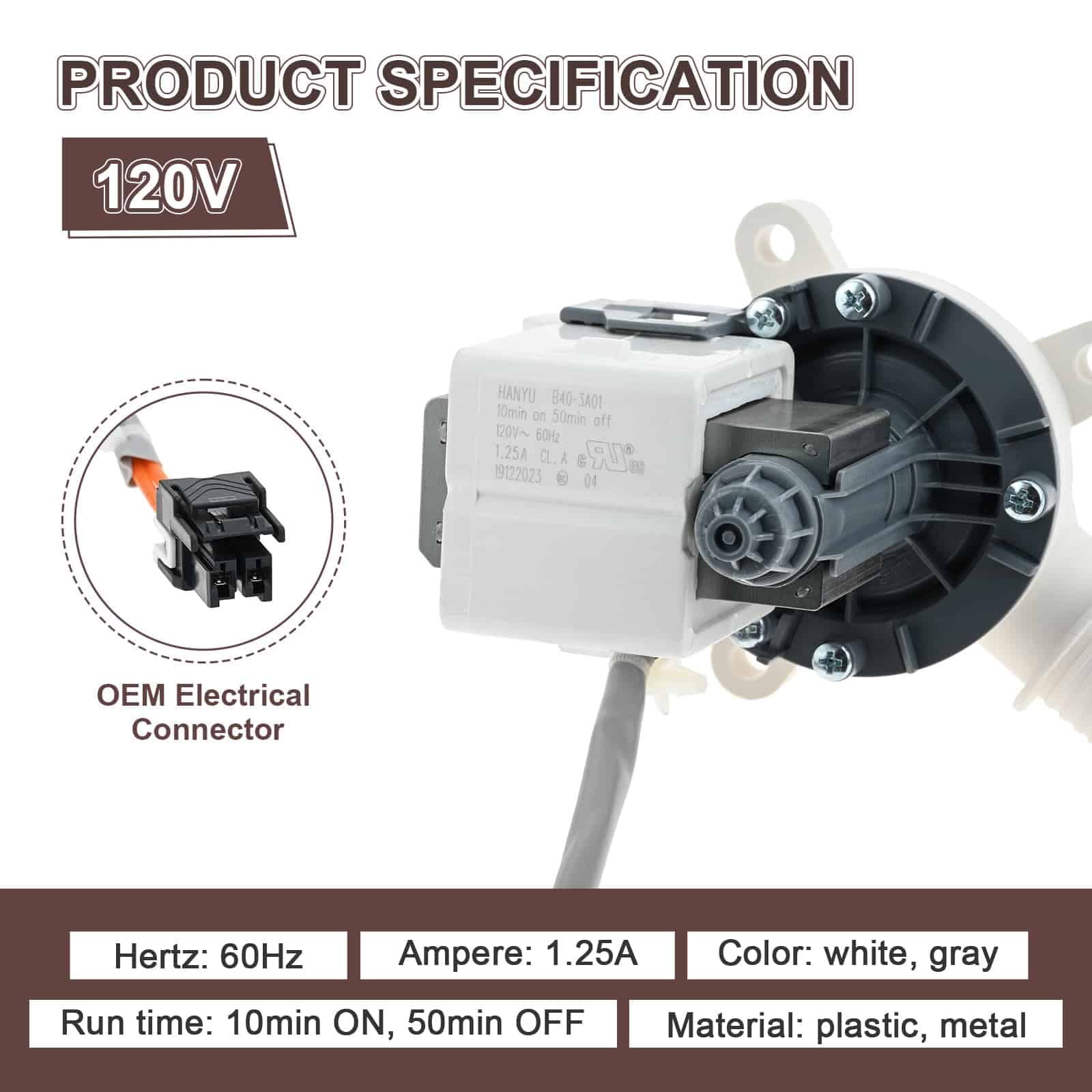 4. Especificación electrónica: 120V, 60Hz, 1.25A. Tiempo de funcionamiento: 10 minutos encendido, 50 minutos apagado. Material: plástico, metal. Color: blanco, gris.