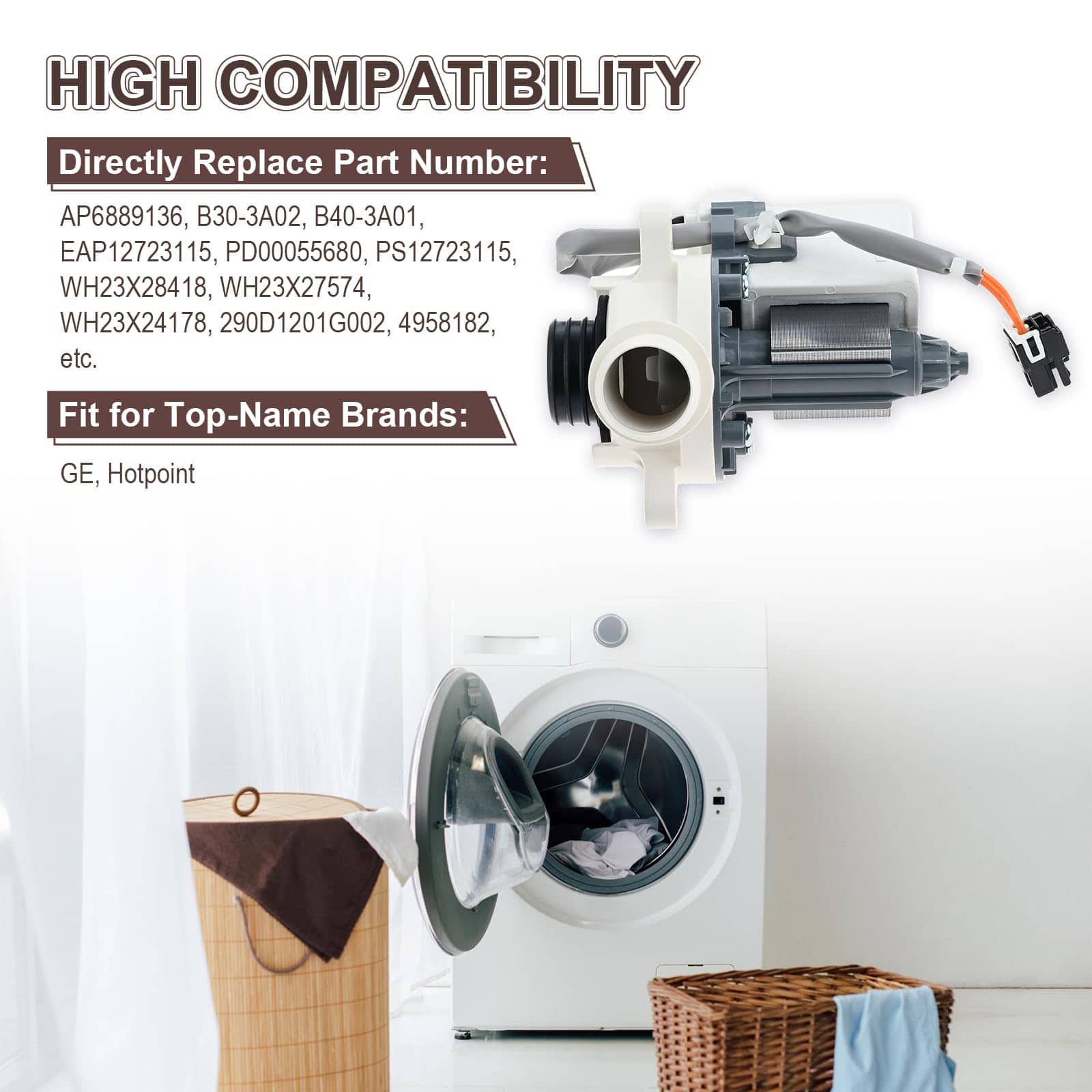 1. Esta bomba de drenaje de motor para lavadora de repuesto para GE puede reemplazar el número de parte: AP6889136, B30-3A02, B40-3A01, EAP12723115, PD00055680, PS12723115, WH23X28418, WH23X27574, WH23X24178, 290D1201G002, 4958182, etc.