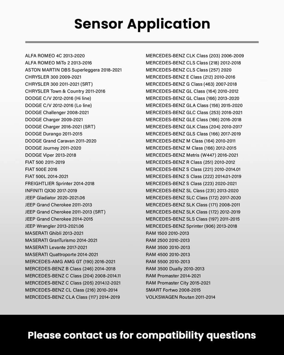 Una herramienta de servicio TPMS adecuada puede ser necesaria para vehículos que cumplen con el reajuste manual. La instalación y emparejamiento de sensores TPMS requiere cierto nivel de conocimiento, habilidad y equipo especial. Recomendamos que mecánicos certificados realicen la tarea. Los sensores TPMS Mobiletron se fabrican cumpliendo con las normas ISO, SAE y GB, y están diseñados para reemplazar los sensores originales en el mercado de repuestos automotrices. Este sensor está preprogramado para adaptarse a los vehículos compatibles listados anteriormente. Alfa Romeo, Chrysler, Dodge, Fiat, Frieghtliner, Infiniti, Jeep, Maserati, Mercedes, RAM, Smart. Especificación: – Frecuencia: 433 MHz – Rango de Presión: Máx. 116 PSI – Rango de Temperatura de Operación: -40 C a 115 C