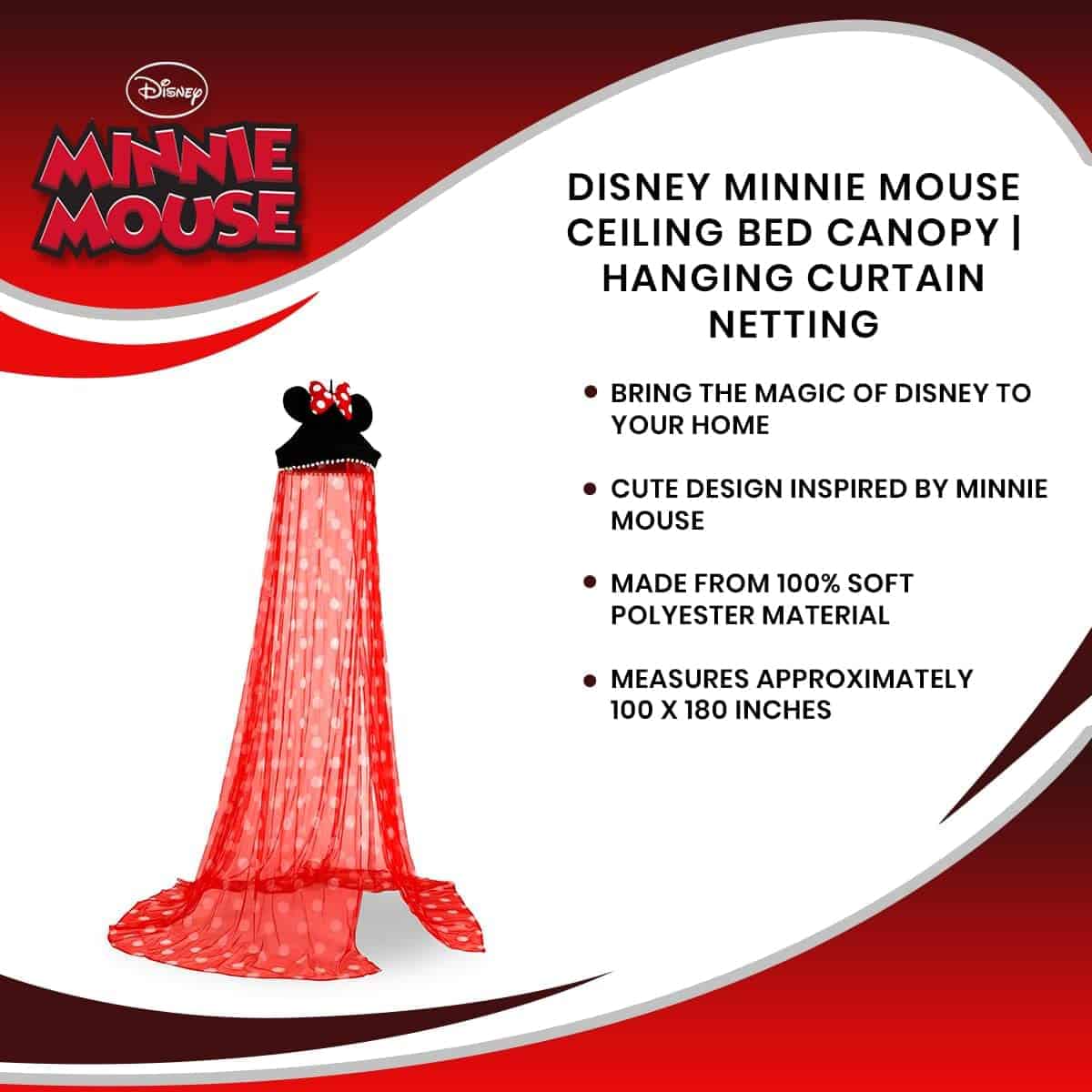 ELEMENTOS ESENCIALES DE LA HABITACIÓN DE NIÑOS QUE TE HARÁN DECIR, «¡OH, CHICO!» Si el estilo lindo de Minnie es un favorito en tu casa, lleva este Mosquitero de Cama de Minnie Mouse de Disney para agregar un toque audaz de color. Con sus lunares y lazo característico, esta elegante cortina de mosquitero se ve genial colgada en una guardería, la habitación de un niño o un espacio de juego. DONDE EL FANATISMO DE DISNEY SE ENCUENTRA CON LA DECORACIÓN DEL HOGAR Esta cortina de cama con las orejas de Minnie Mouse en la parte superior incluso puede designar un lugar especial para la niña o niño cumpleañero, haciendo doble función como decoración y regalo. Ideal para instantáneas en redes sociales, todos tus amigos dirán que tu estilo es impecable. Disfruta de una sobrecarga de ternura con este Mosquitero de Cama con Minnie Mouse con licencia oficial inspirado en el popular ícono de Disney.