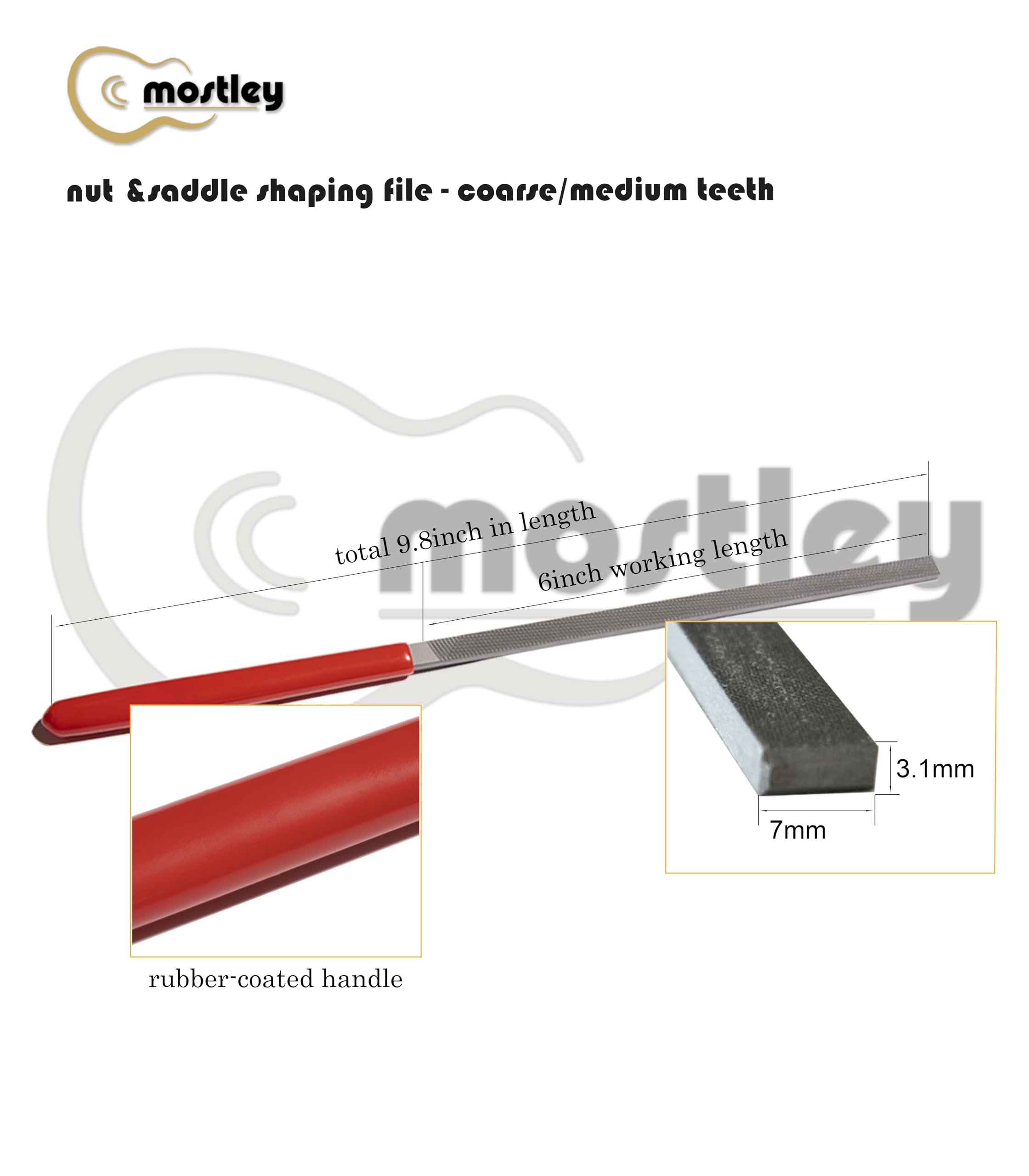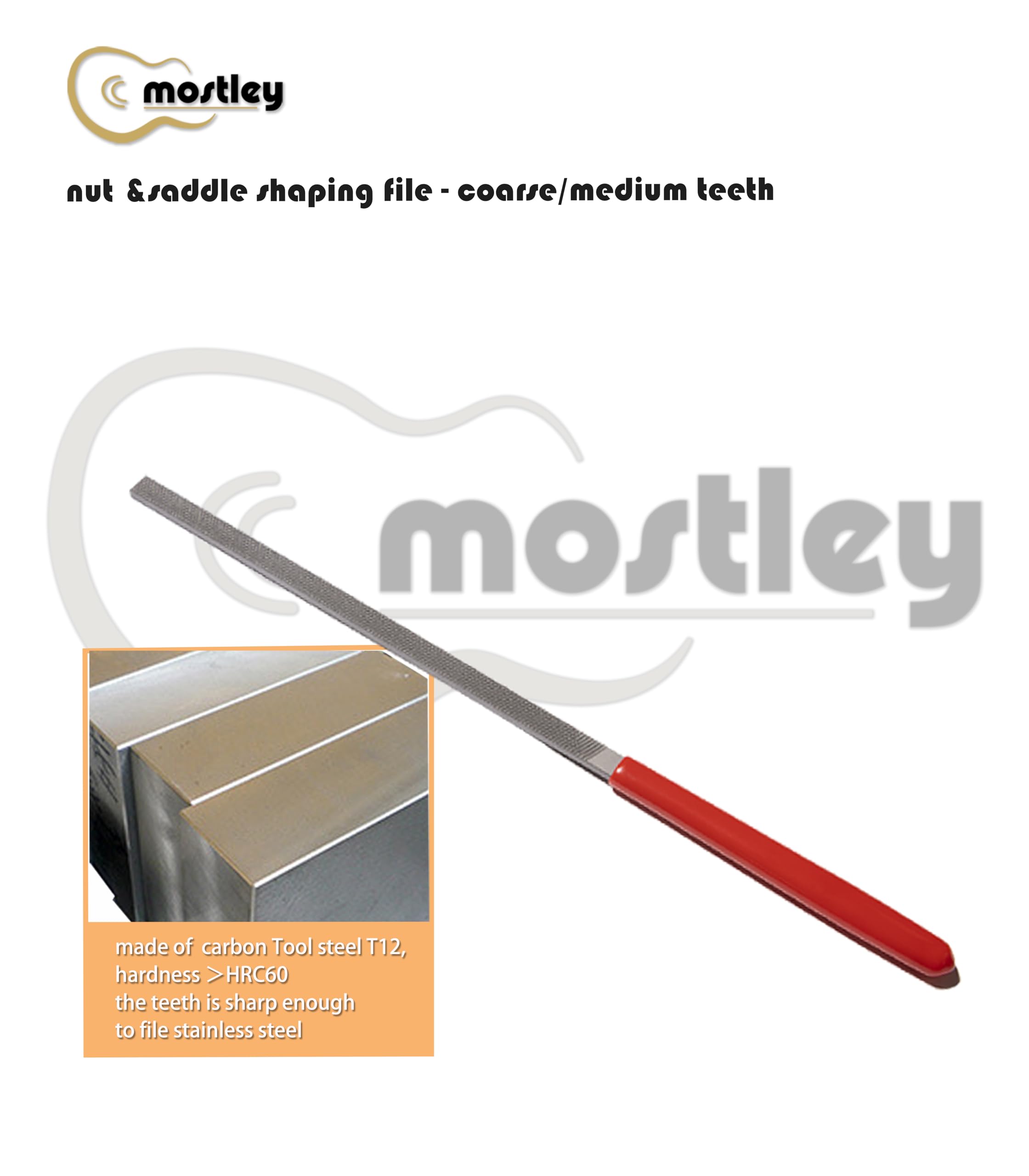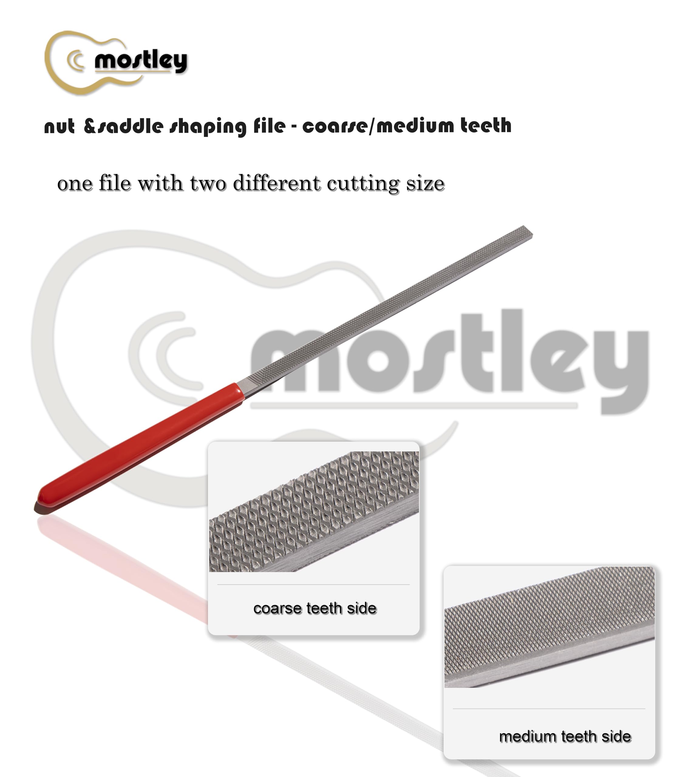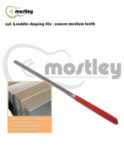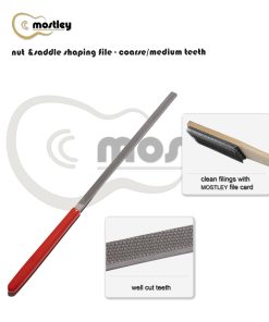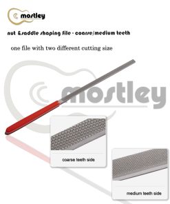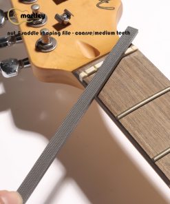 Una cara con dientes medianos y la otra con dientes gruesos, las 2 superficies de corte diferentes hacen que el trabajo en la tuerca y la selleta sea más fácil y cómodo. Ideal para dar forma a la selleta del puente y la tuerca, limar golpeadores y otras partes de plástico. También es bueno para limpiar el extremo del diapasón después de quitar una tuerca. La estructura especial de la lima con diversos dientes de corte te permite trabajar fácilmente en muchos tipos de tuercas, como hueso, tusq, micarta, plástico, madera, etc. Con mango recubierto de goma, estas limas de tuerca son fáciles de sujetar y proporcionan suficiente área de limado (longitud de trabajo de 6 pulgadas) para realizar muy bien el trabajo.