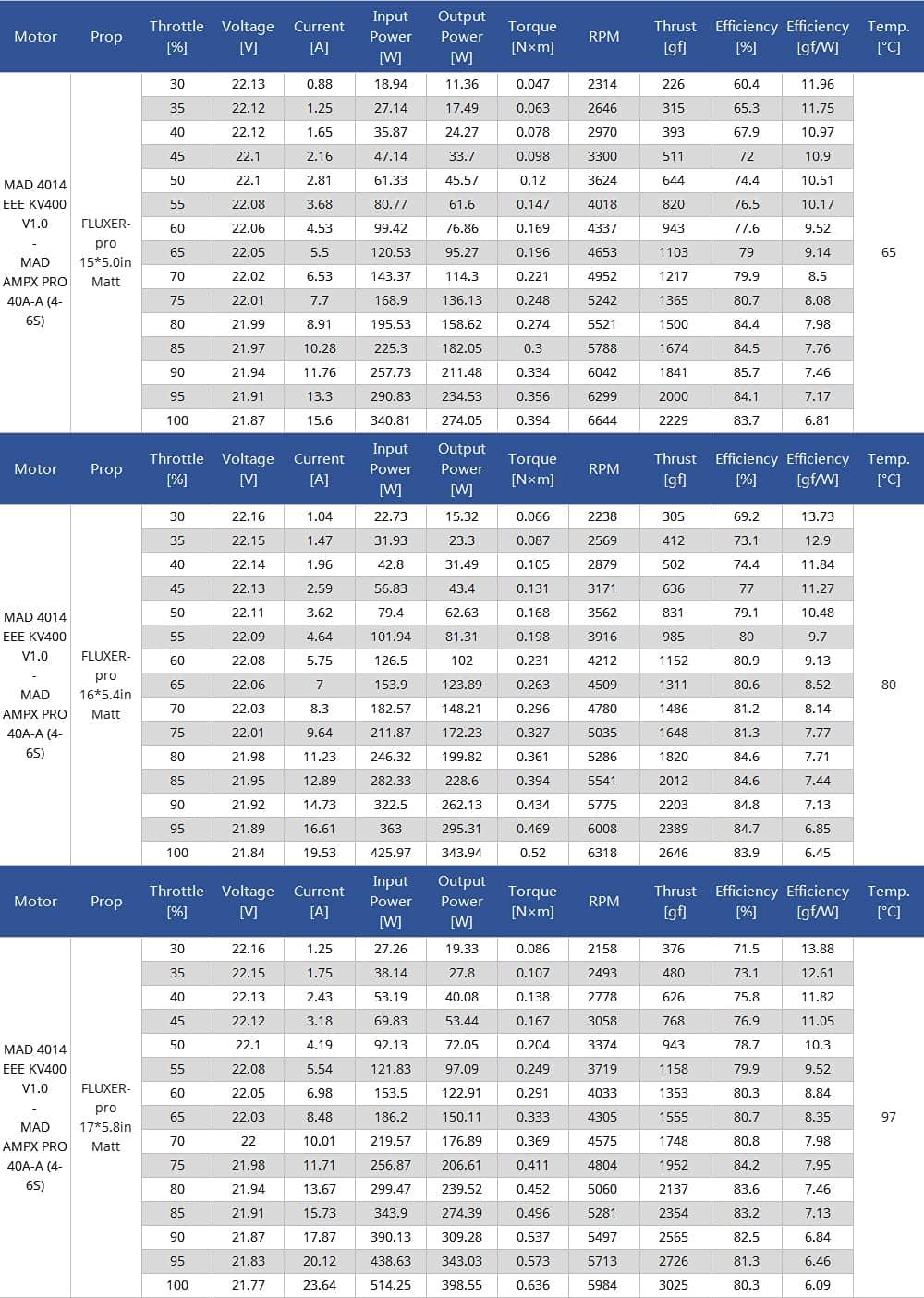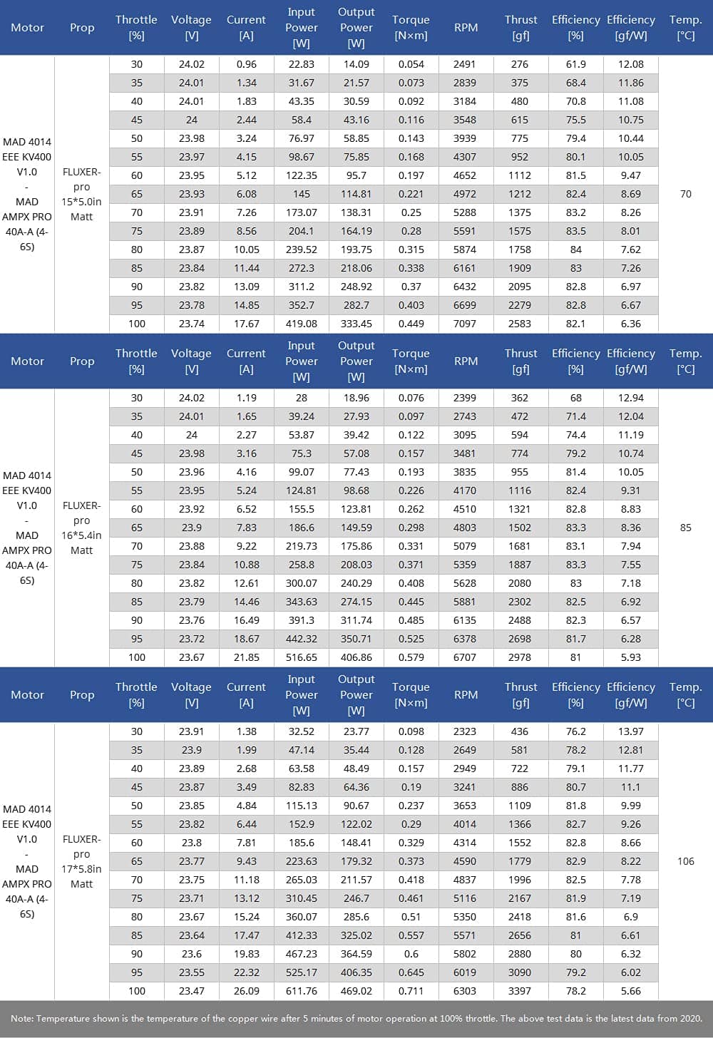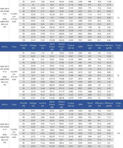 MAD 4014 EEE motor brushless potente y de alto empuje para multirotor agrícola con 15-17 IN PROP. Diseñado para transportar una carga de 600-2000g por motor, con hélice de 15-17 pulgadas. Soporta Li-ion 6S-12S. El mayor empuje de un solo rotor es de hasta 4300g. El peso del motor es de 154g. Diseño de versión de reducción EEE para minimizar el peso, mejorar la eficiencia del sistema y aumentar el tiempo de vuelo. Motor MAD 4014 EEEConfiguración 18N24P, Tamaño del estator 40X14mm, Dimensiones del motor 44.9X31.7mm, Grado de cable barnizado de 120 alto grado de temperatura, Grado de imán de 180 alto grado de temperatura, Grado de Protección resistencia a la lluvia, KV 400KV, Voltaje nominal 6S, Corriente sin carga 1.12A, Resistencia interna 123m, Peso del motor 154g, Corriente máxima 23.25A, Cable 150mm, Disipación de calor centrífuga SI, Rotor equilibrado 5Mg, Prueba de presión de alambre 500V CA, Orificios de montaje de la hélice 12-M3 4, Montaje del motor 32-M2.5 3/ 25-M3 4, Tamaño de la caja 110mmX110mmX50mm, Potencia máxima 558W, Empuje máximo 3157g, Par máximo 0.87N m, ESC recomendado MAD 40A ESC, Hélice recomendada FLUXER 15′-17′, Peso de despegue del rotor 15’/1.0kg, 16’/1.3kg, 17’/1.5kg, Peso de despegue del motor 17’/4kg-quadcopter,6kg-hexcopter,8kg-octcopter